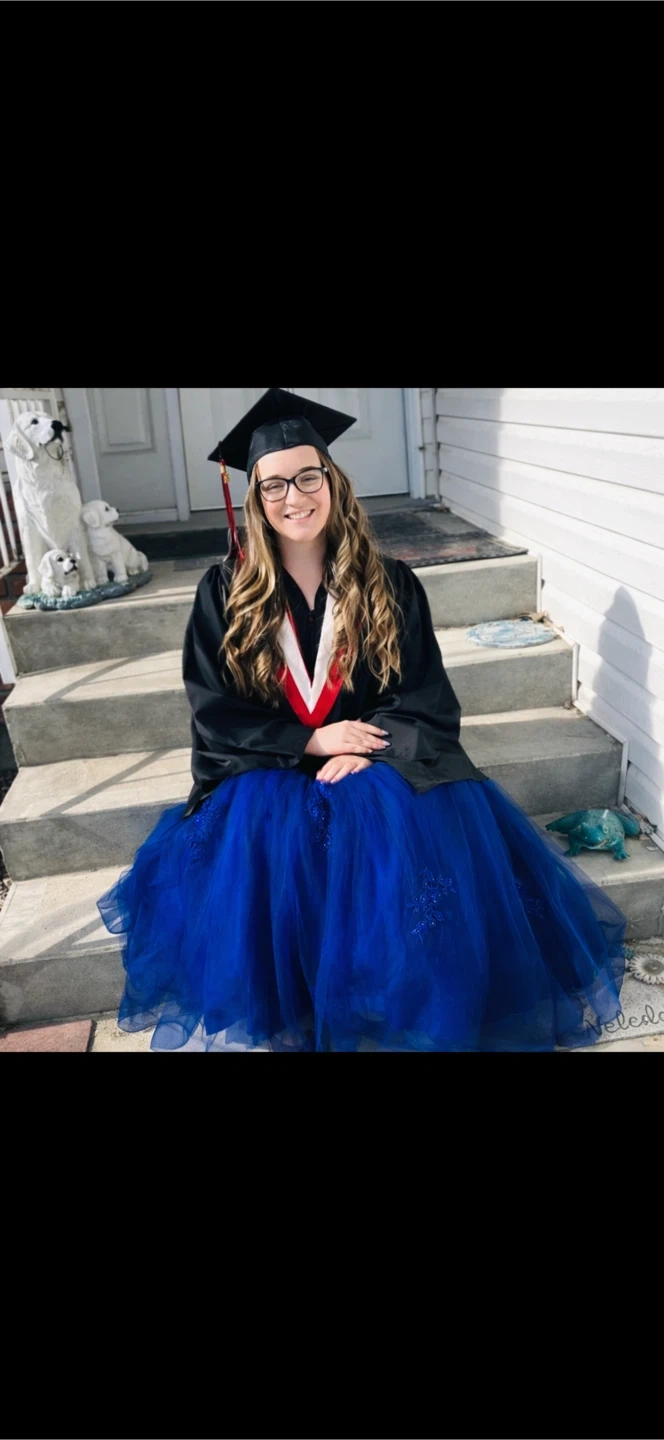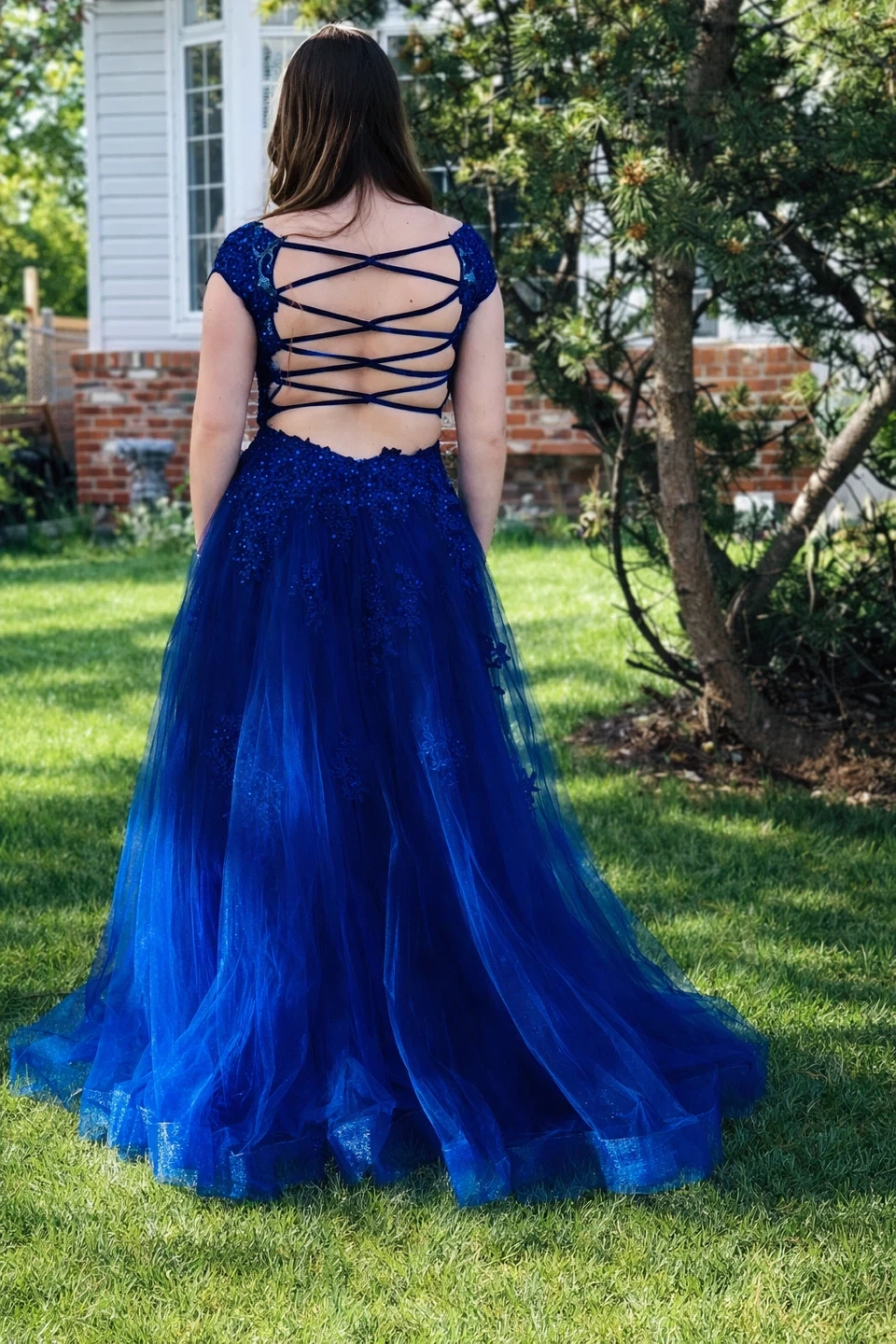 Stunning royal blue graduation dress featuring intricate lace detailing and a flowing tulle skirt. The dress has a flattering fit and elegant design that photographs beautifully. Worn once and in excellent condition, with no damage or alterations.