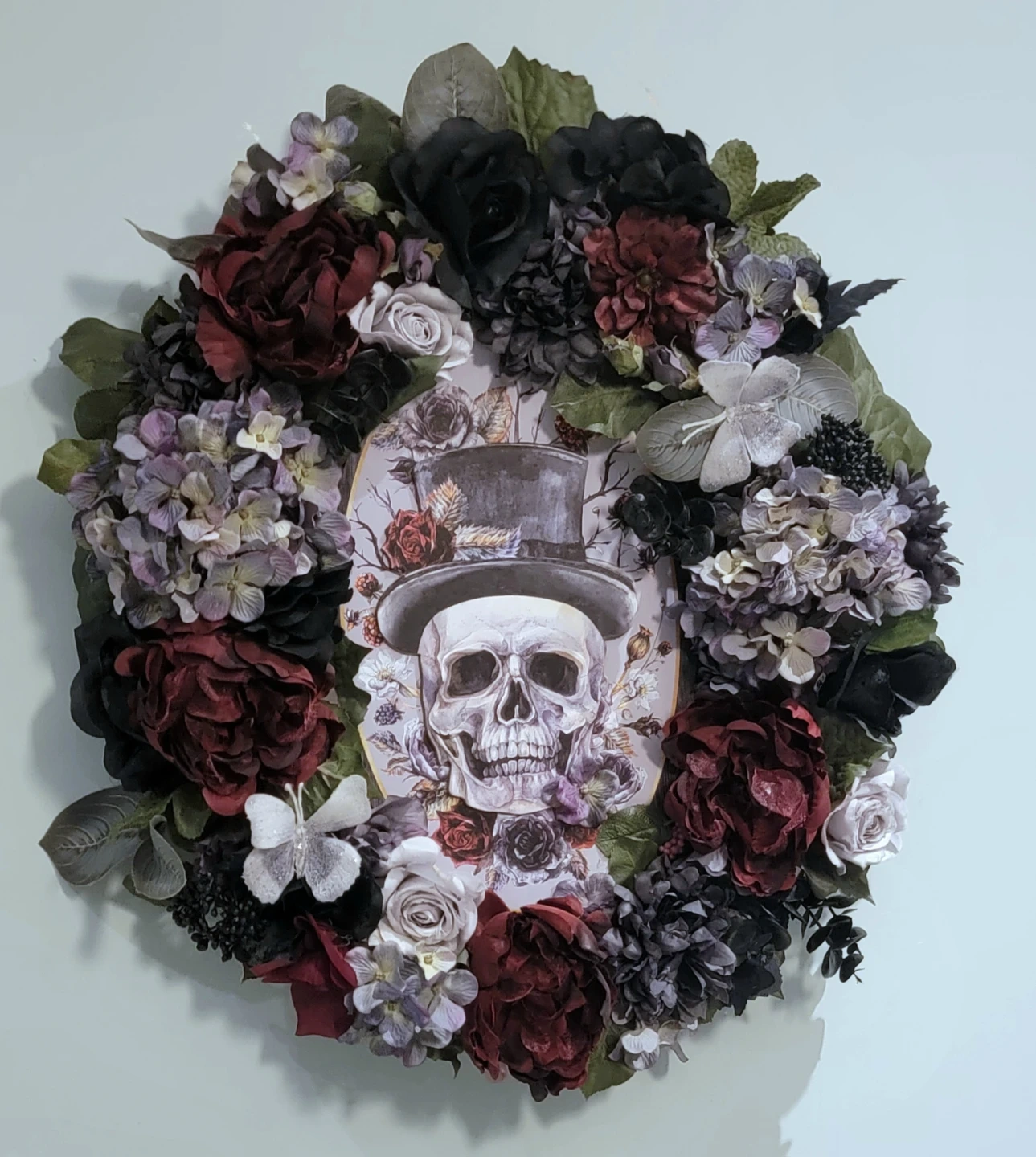This unique Halloween wreath features a spooky skull centerpiece surrounded by a mix of dark red, black, and purple flowers, with accents of greenery and berries. It's perfect for adding a festive and eerie touch to your front door or home decor during the autumn season. Three wreaths for 20 each or 60 for three