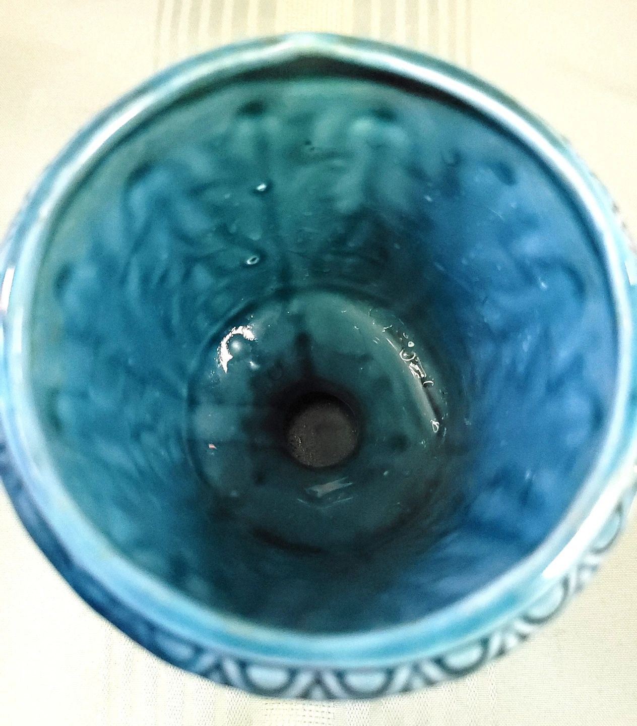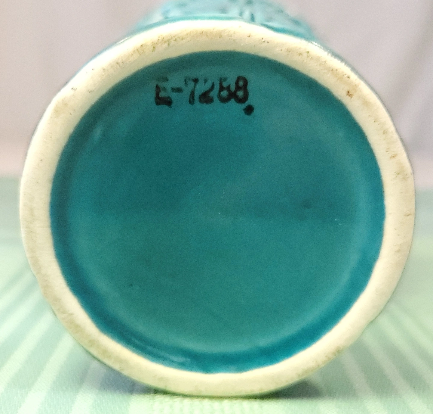 This piece is in good pre-loved condition. The exterior glaze is bright and intact. As shown in the photos, there is some green/mineral discoloration on the interior base; this is consistent with the item's age and past use as a planter.
