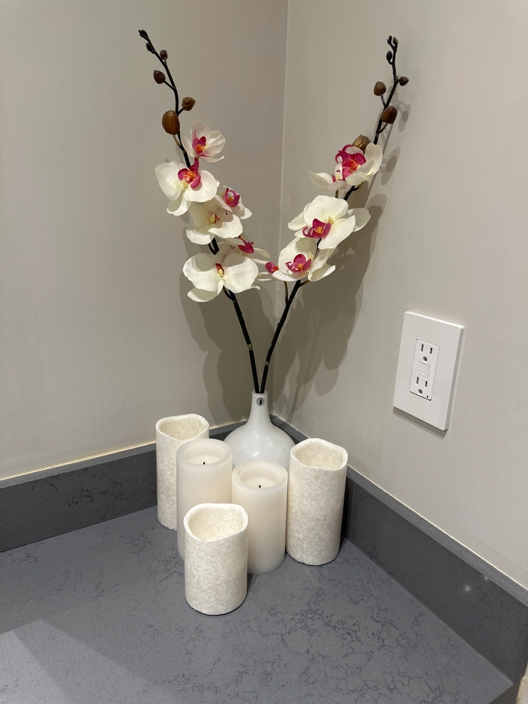 Set of four white LED pillar candles. Textured finish. Included: artificial orchid arrangement in white and pink. Vase included.
