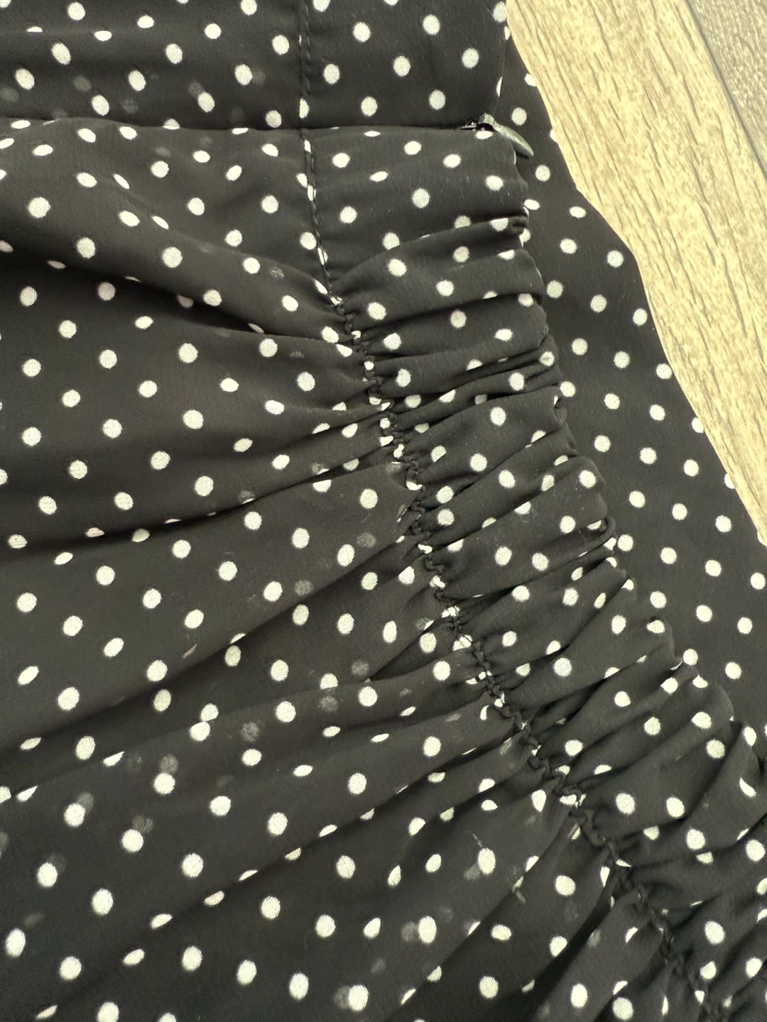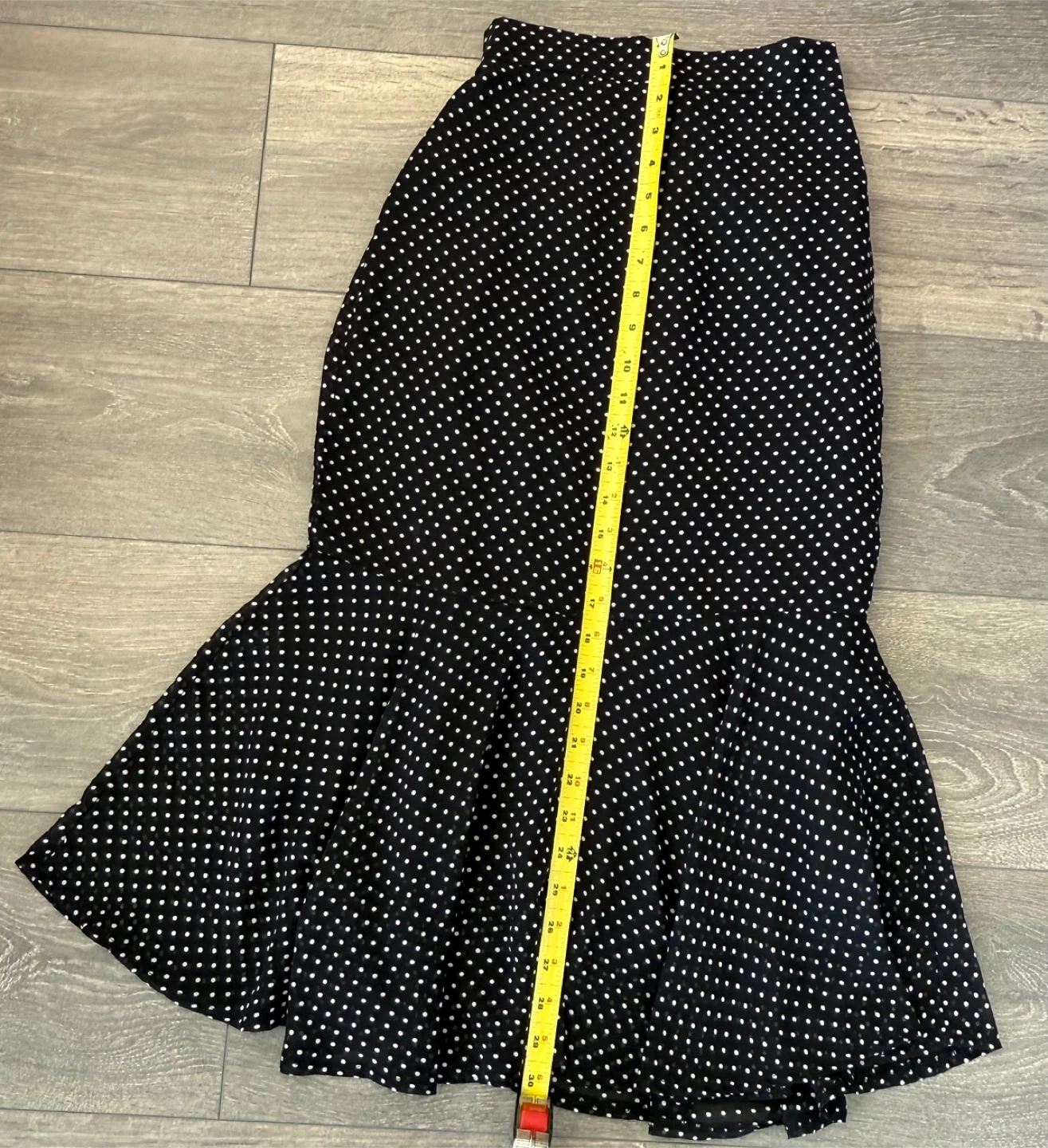 Cute black and white polka dot skirt with a ruffle hem! It's in great condition and ready for a new home. The fabric is lightweight and flowy, perfect for warmer weather
