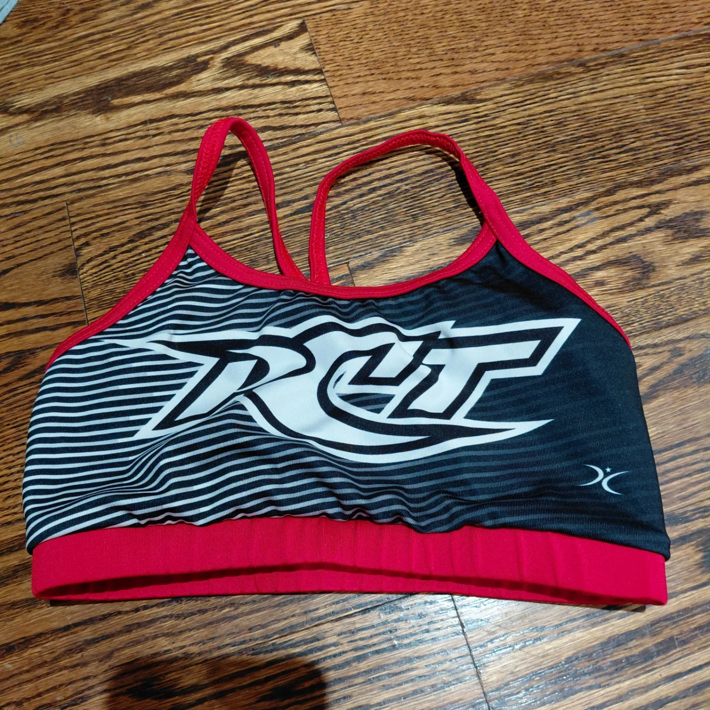 33Selling a cute PCT sports bra! It features a black and white striped pattern with red trim. The PCT logo is prominently displayed in white. Perfect for workouts or casual wear!