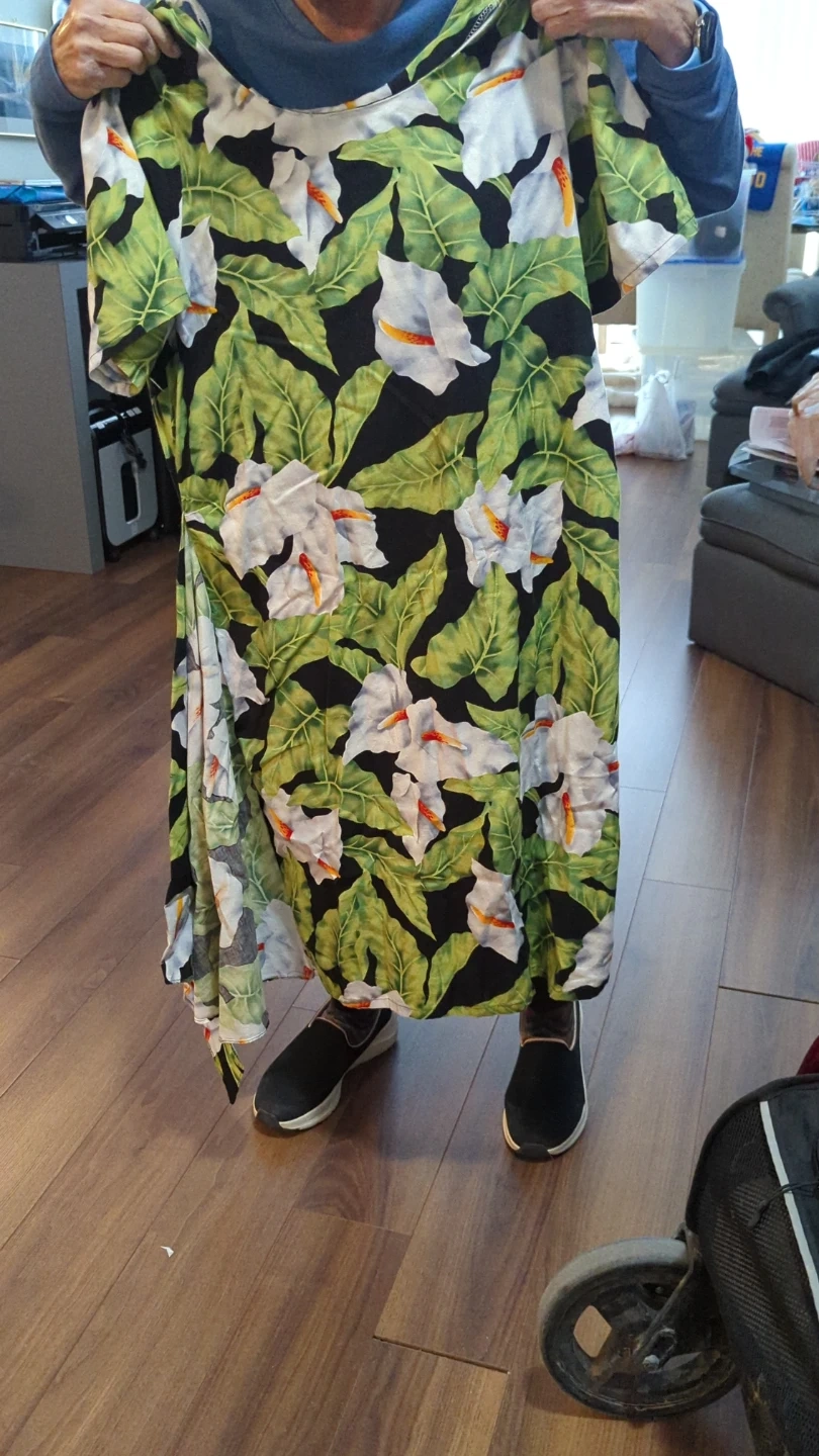 This is a flowy maxi dress featuring a vibrant tropical floral print with white calla lilies and green leaves on a black background. It has short sleeves and a comfortable, relaxed fit. It's made of a lightweight fabric, perfect for warmer weather.