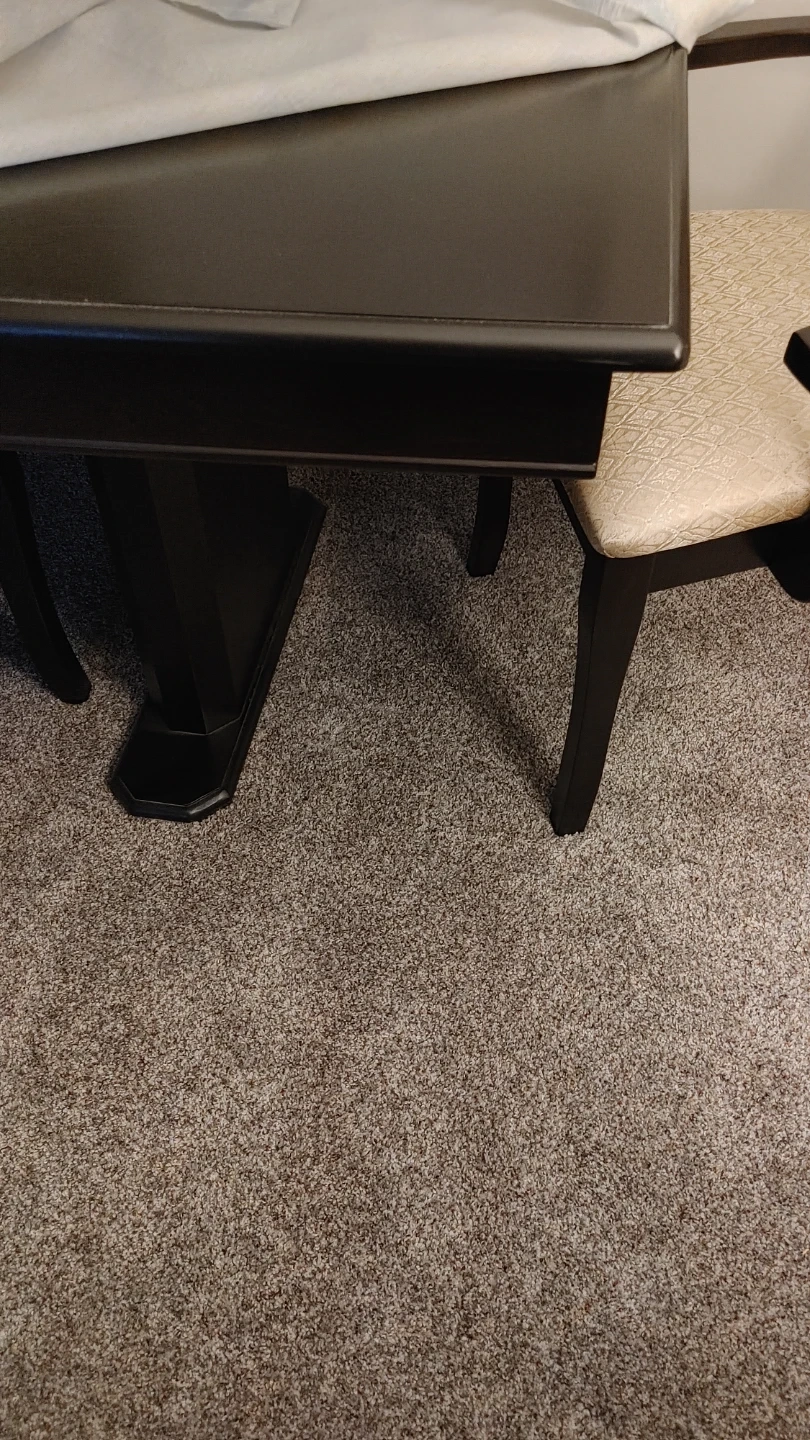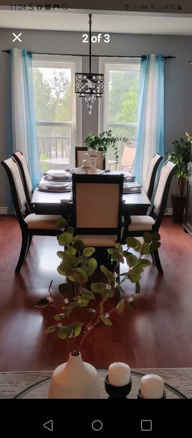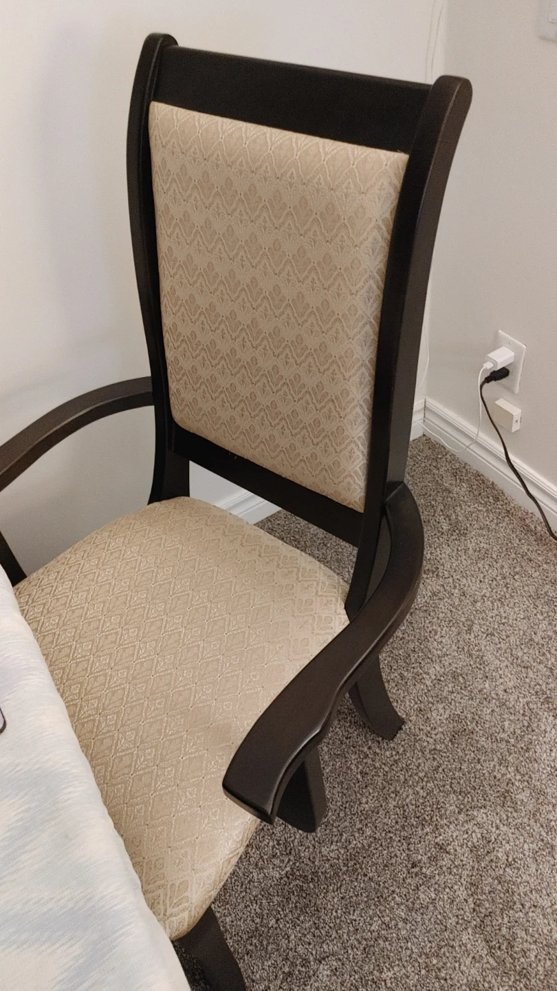 Stylish dark wood dining table with upholstered chairs. The set includes the table and six chairs with patterned beige fabric and center leaf. It's perfect for family dinners or entertaining guests. 41" x 64" .Add 14" with leaf.
