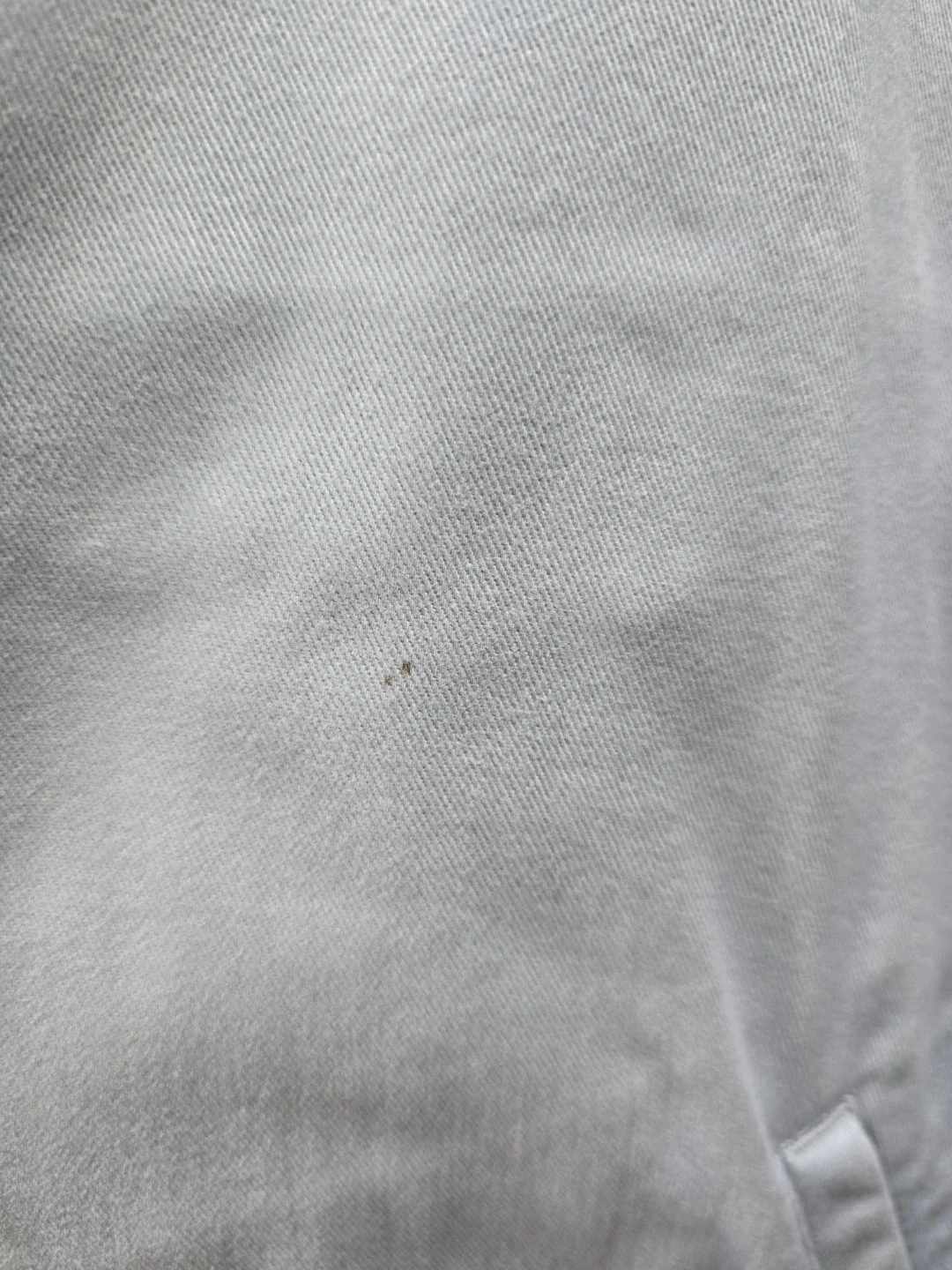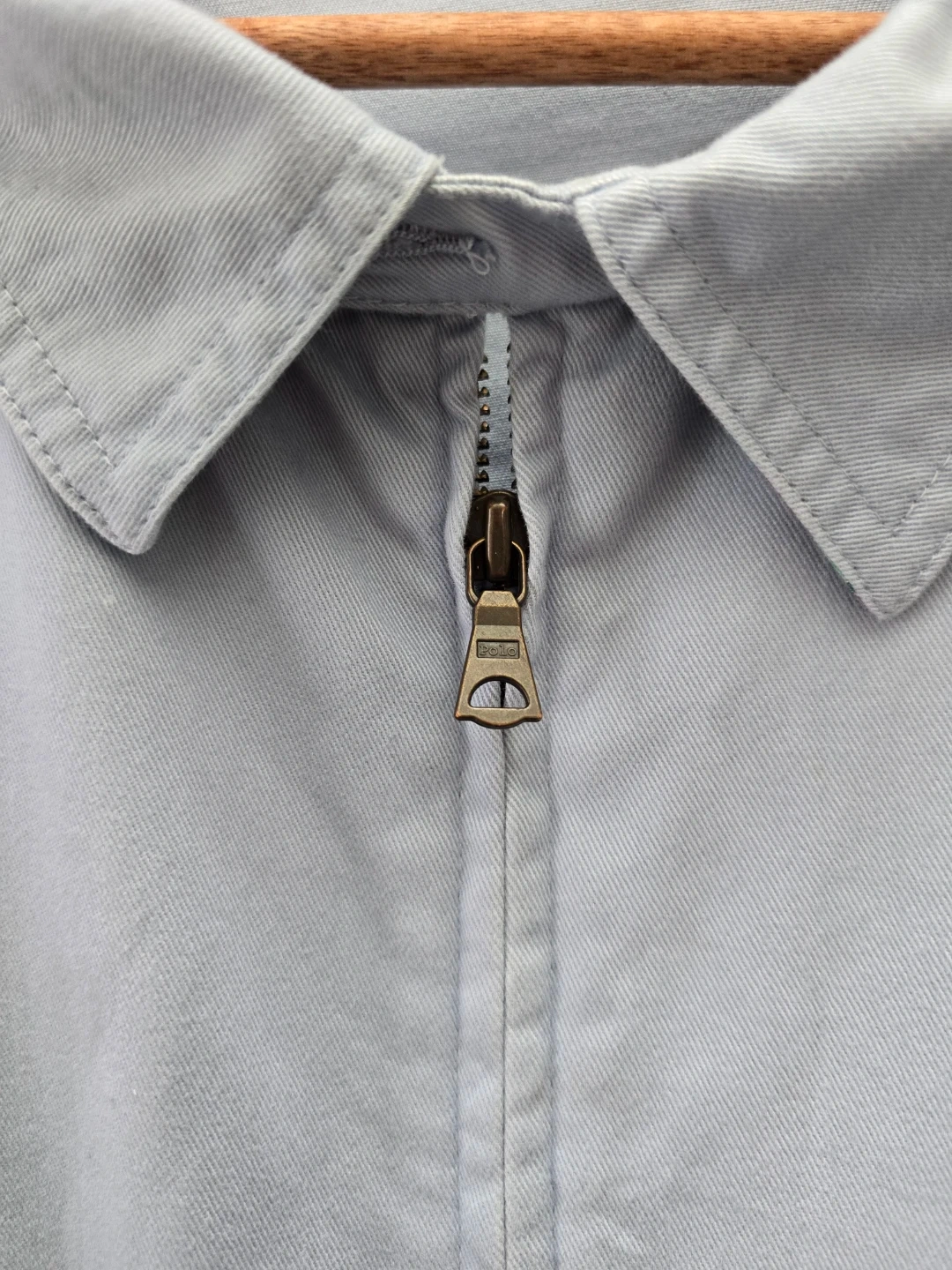 This light blue jacket from Polo by Ralph Lauren features a classic Harrington style with a full zip closure. It's made of 100% cotton for comfort. The interior collar has a plaid lining detail. This jacket is a size XL.