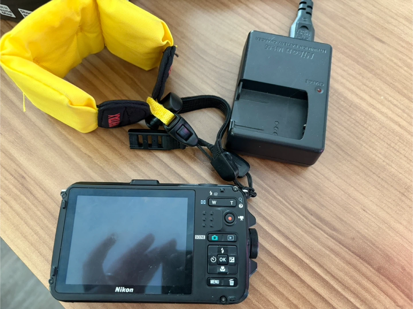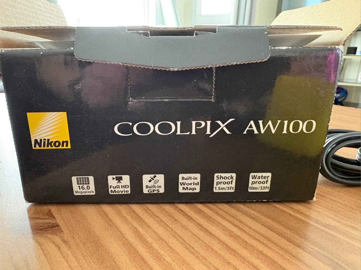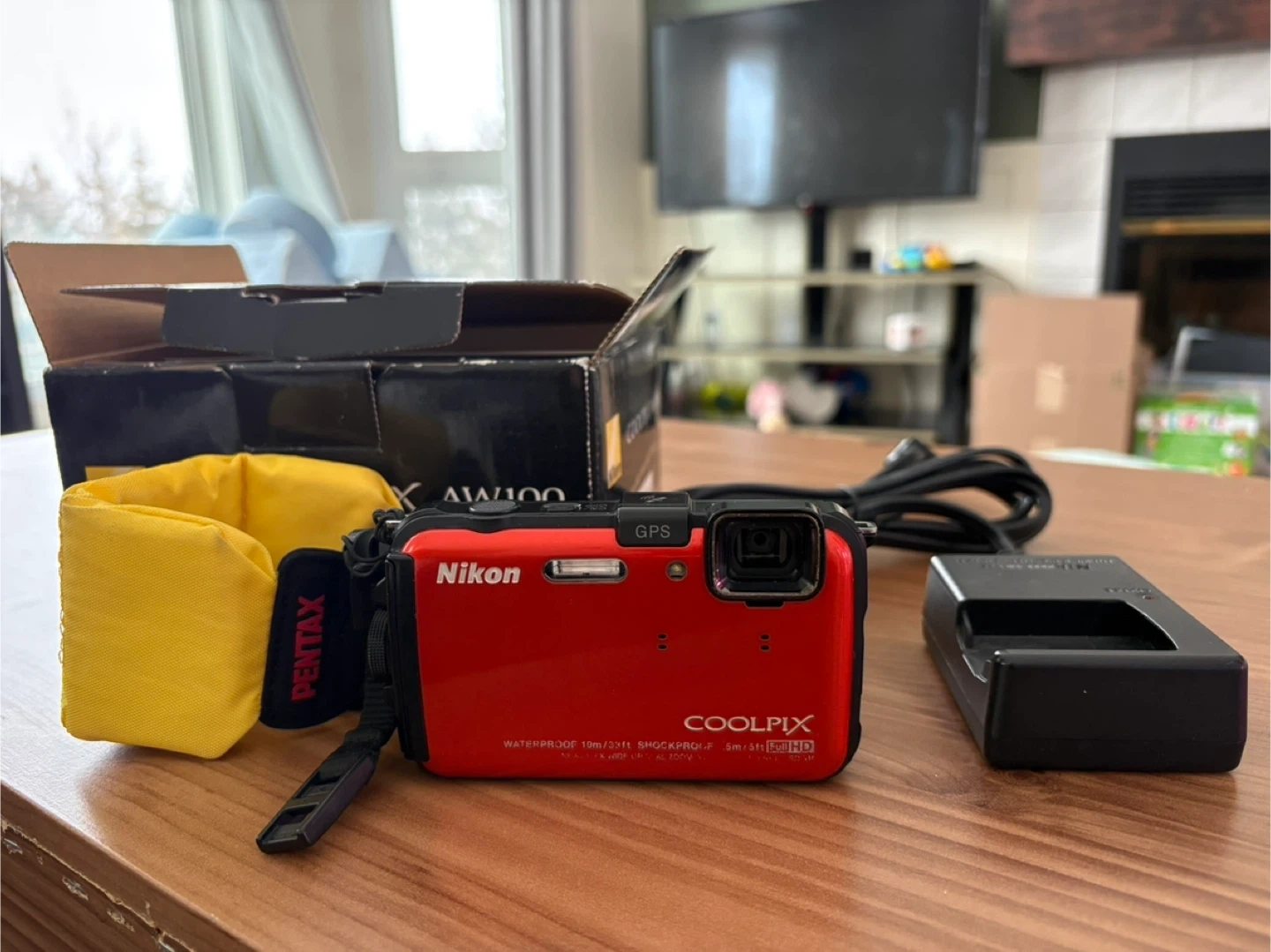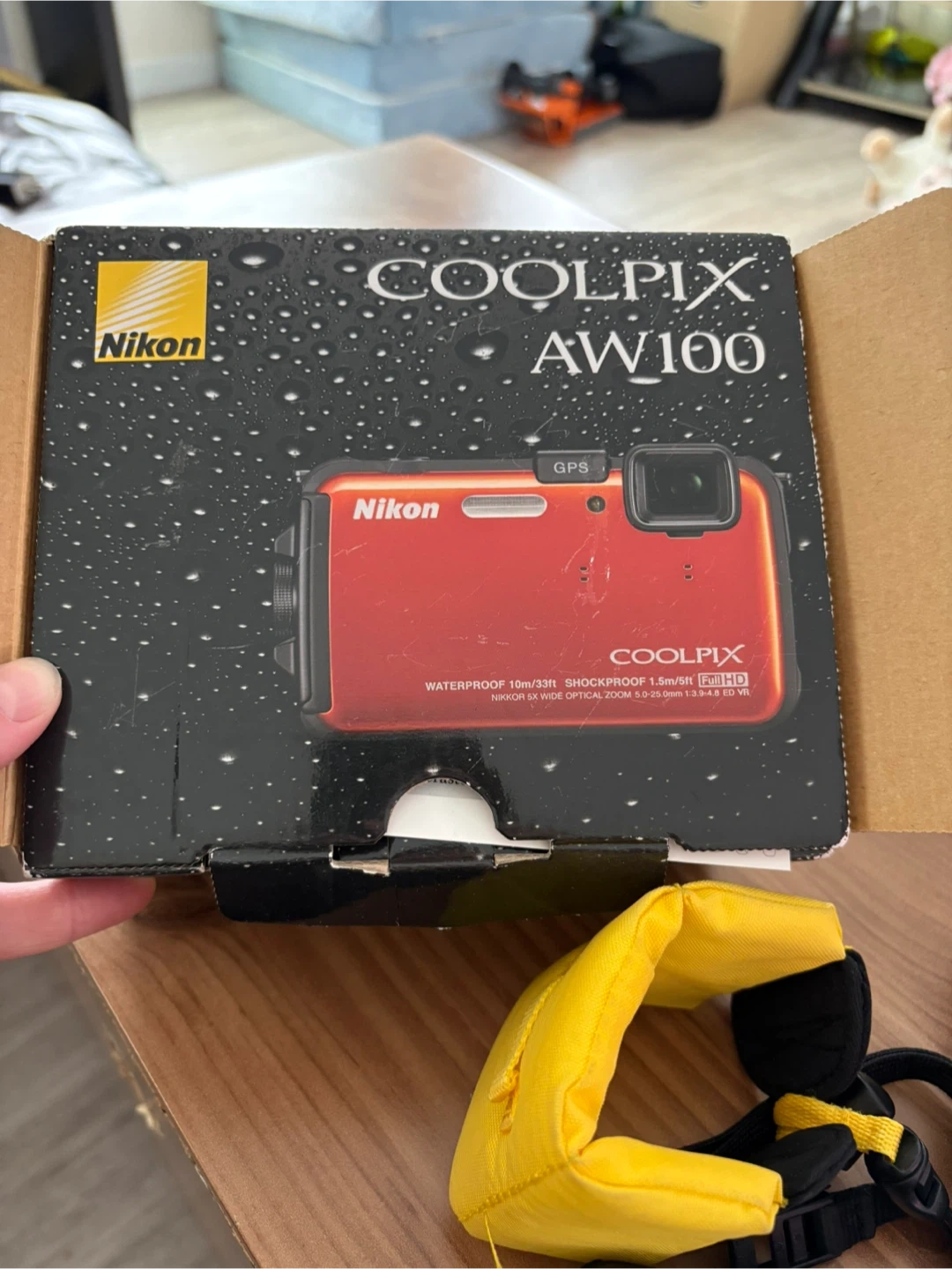 This is a Nikon COOLPIX AW100 digital camera in orange. It's waterproof to 10m/33ft and shockproof to 1.5m/5ft. It comes with the original box, charger, and a yellow floating wrist strap. It also includes GPS functionality.