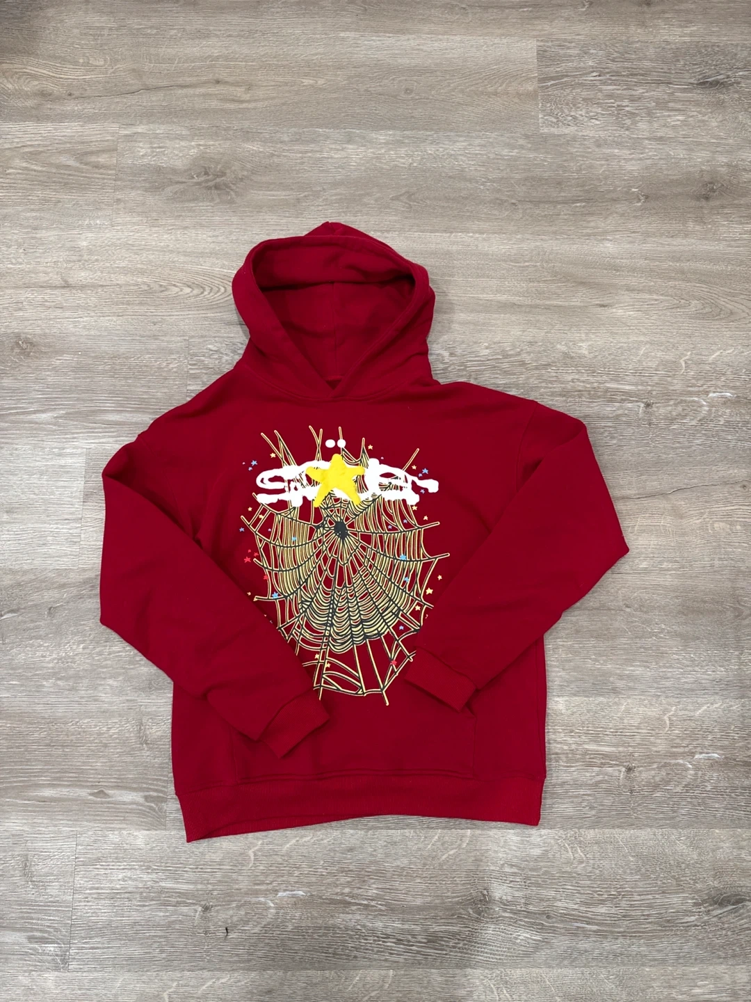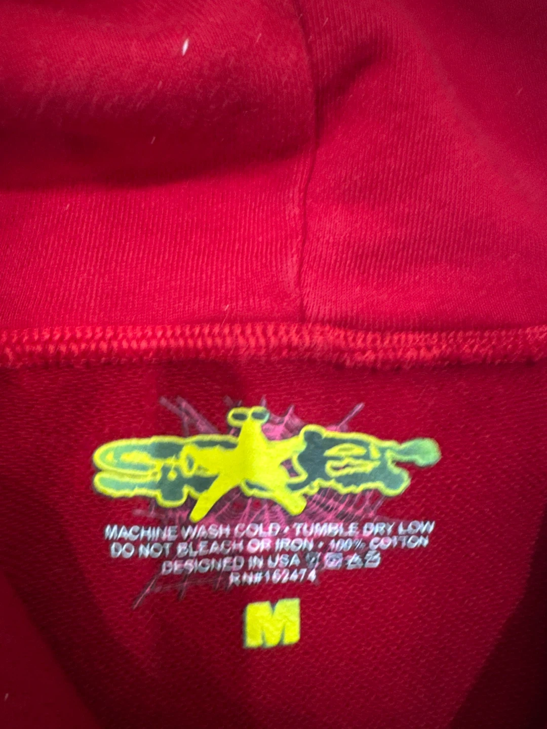 Selling a Spider Worldwide hoodie in red, size medium! The hoodie is made of 100% cotton and has a unique design. Care instructions: Machine wash cold, tumble dry low, do not bleach or iron