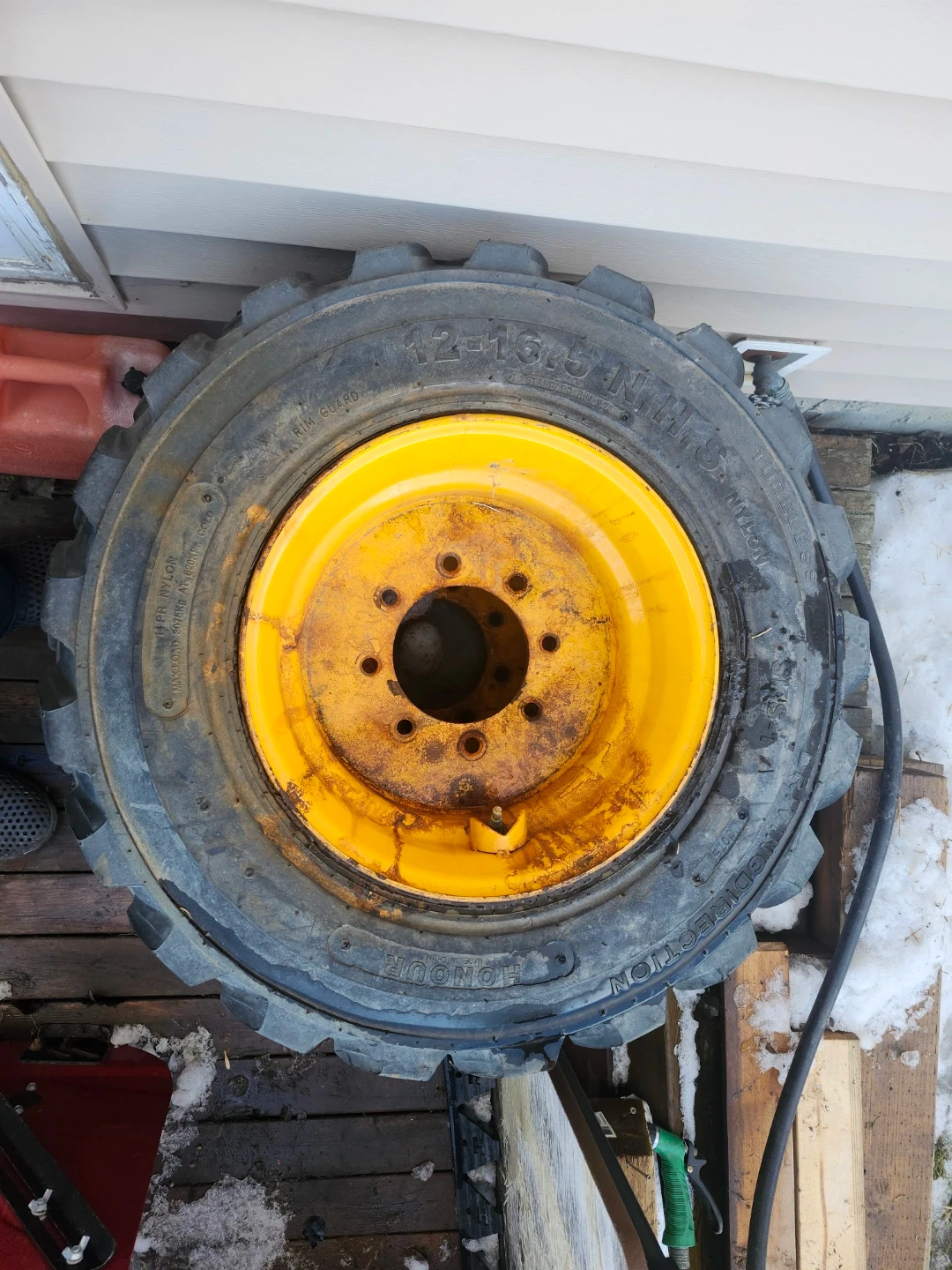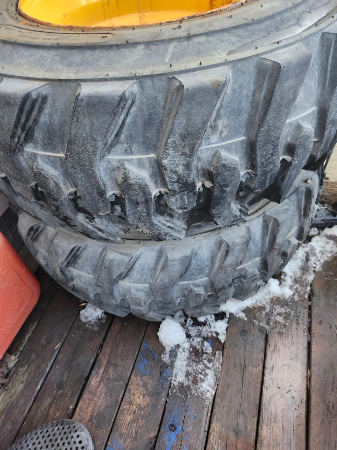 Selling used tractor tires, size 12-16.5. They have a yellow rim and show some signs of wear, as seen in the pictures