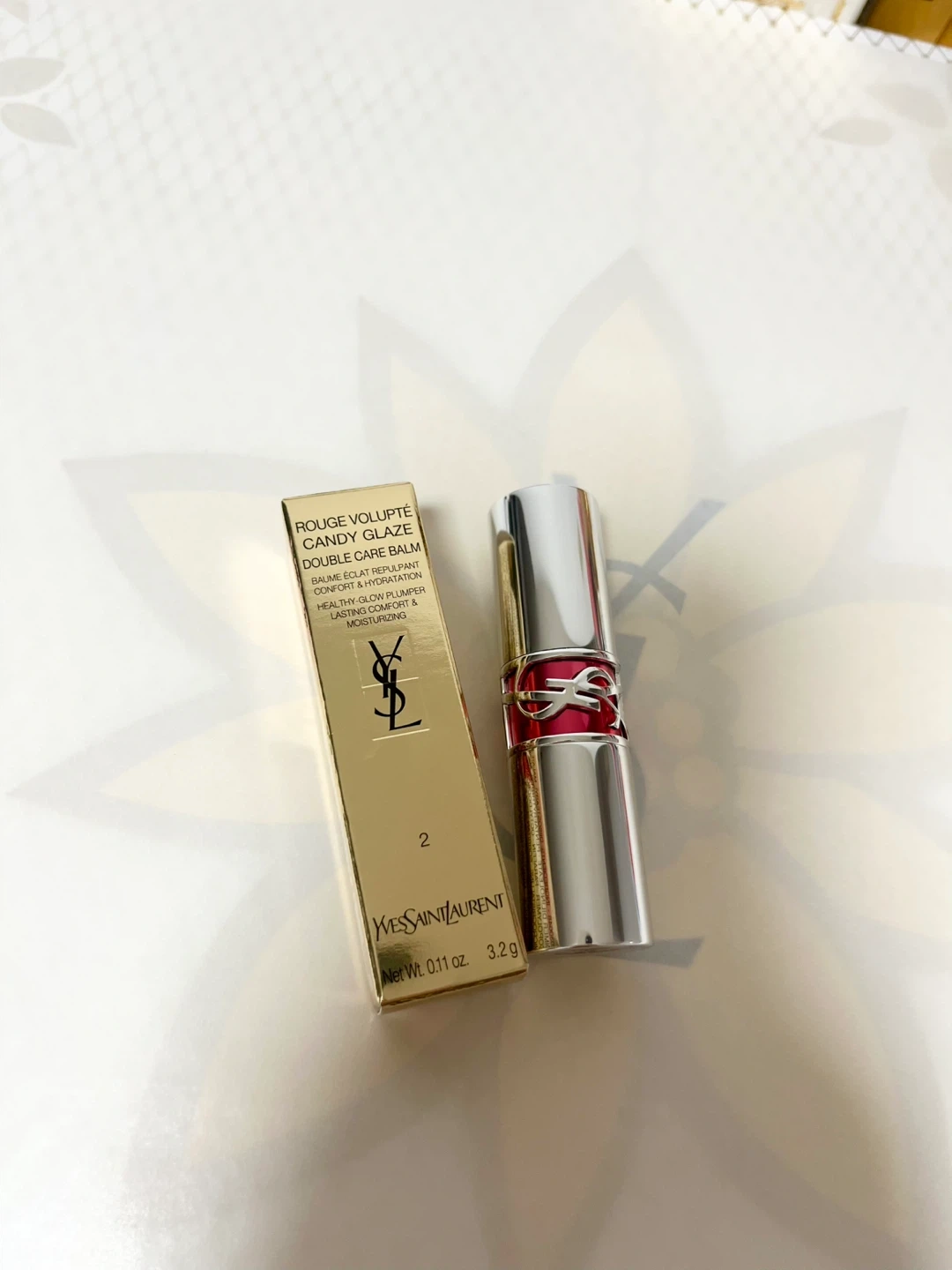 Yves Saint Laurent Candy Glaze Lip Gloss Stick in Shade 2. Offers a healthy glow plumper finish with lasting comfort and moisturizing properties. It's a 3.2g lip product.