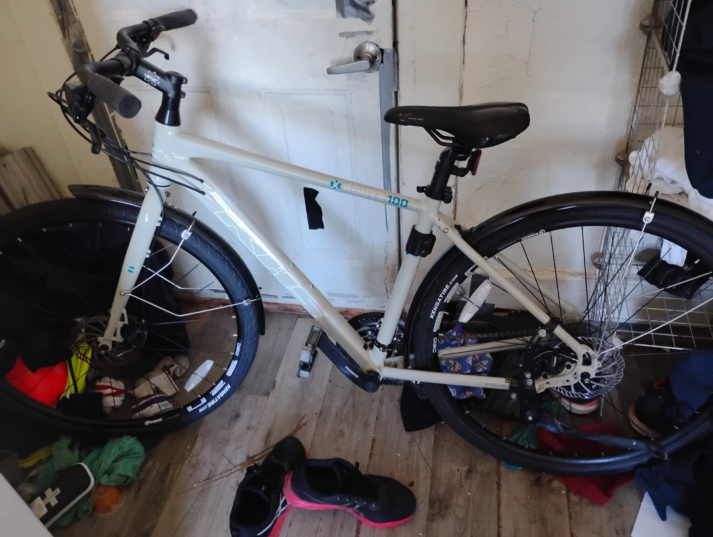 This is a Kona Dew Plus hybrid bike. It has a cream frame and black fenders. Disc brakes are installed for reliable stopping.