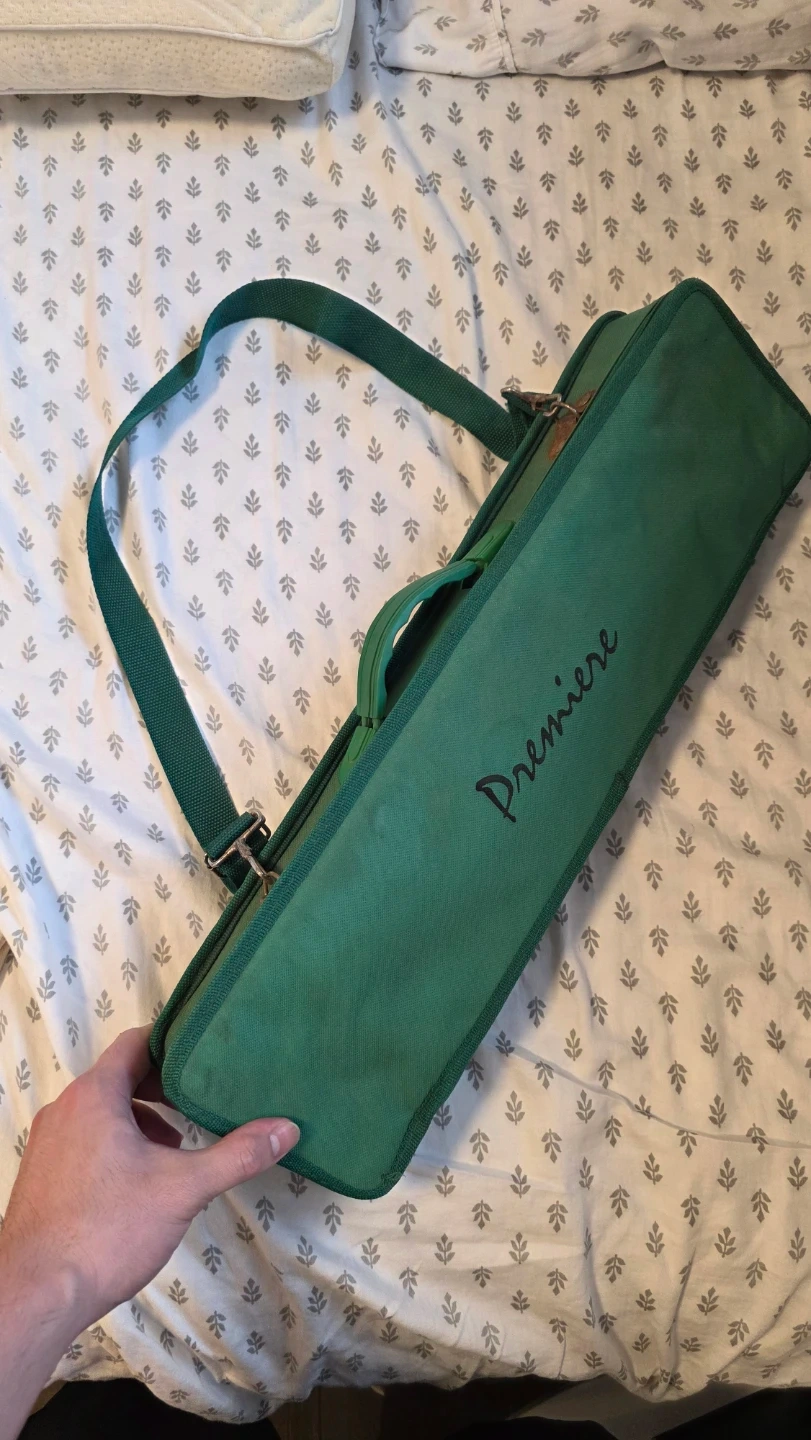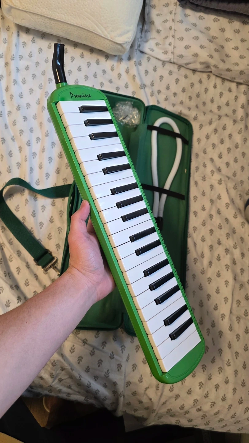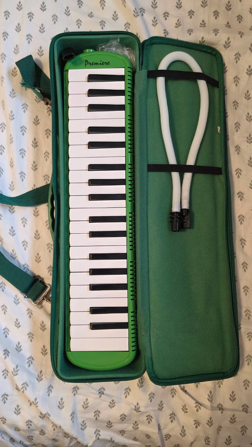 This is a green Premiere melodica. It's in a green carrying case with a shoulder strap. Includes two flexible mouthpieces. Great for learning music!