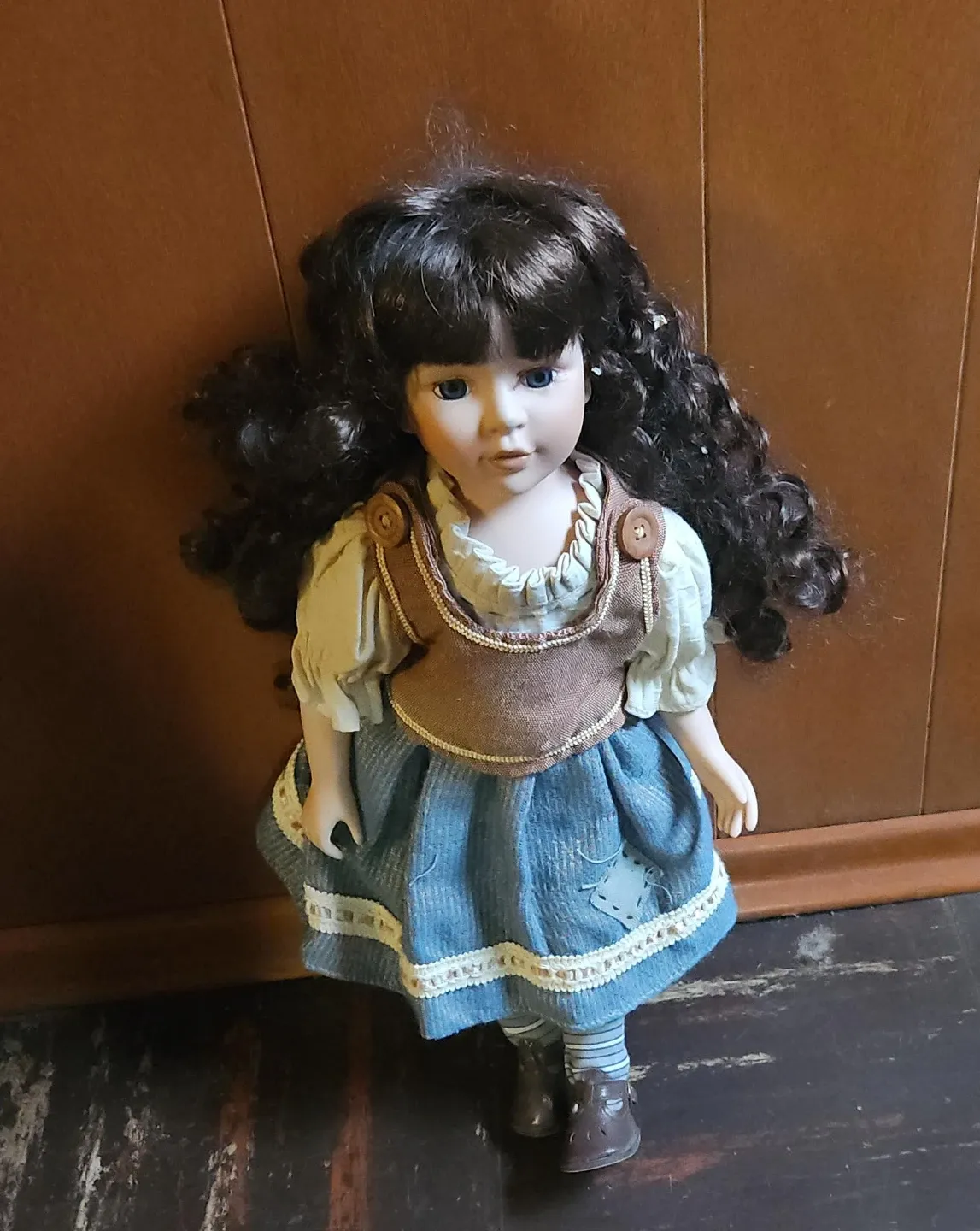 This is a vintage porcelain doll with long, dark curly hair and blue eyes. She's wearing a blue denim-style skirt with white trim, a cream-coloured blouse, and a brown vest. This doll would be a lovely decorative piece for a collector.