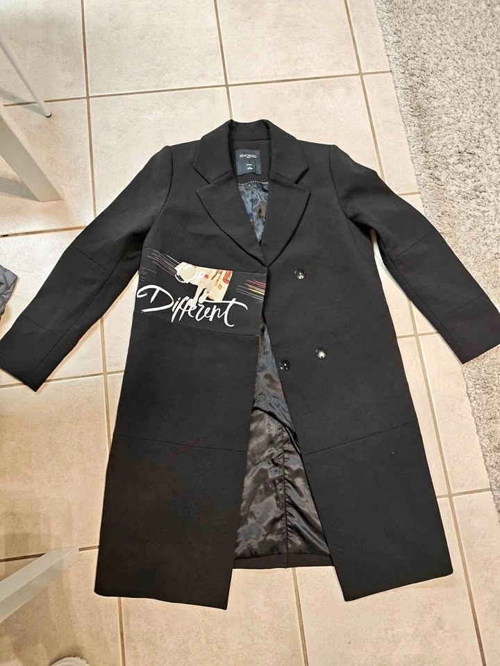 Unique black PEACEBIRD long coat with a cool 'Different' graphic on the front that really stands out. The inner lining is black. It's also super comfy. Fits me at 165cm and 55kg.