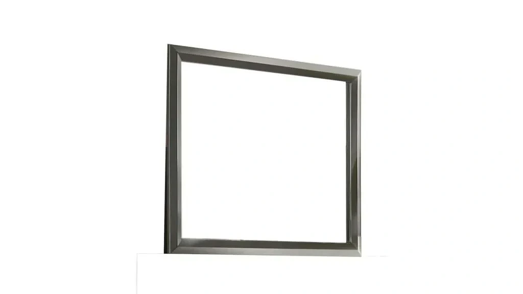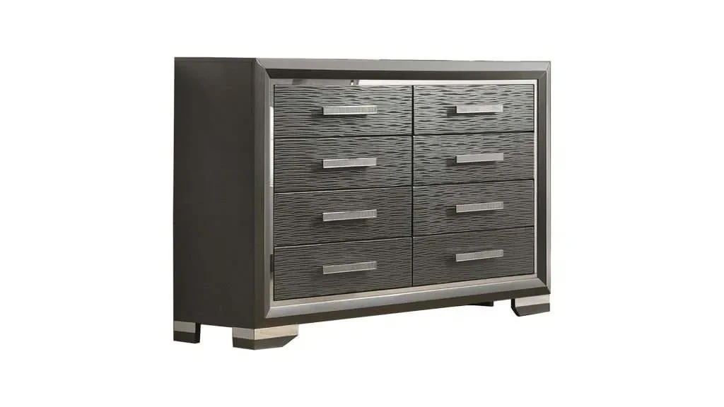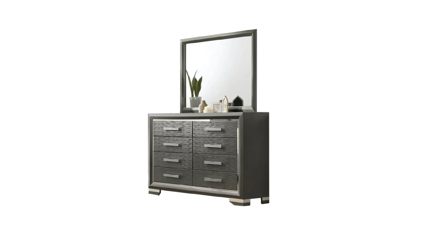 This grey dresser features six drawers with textured fronts and silver handles. It includes a matching mirror with a sleek frame. Plenty of storage for your bedroom essentials!