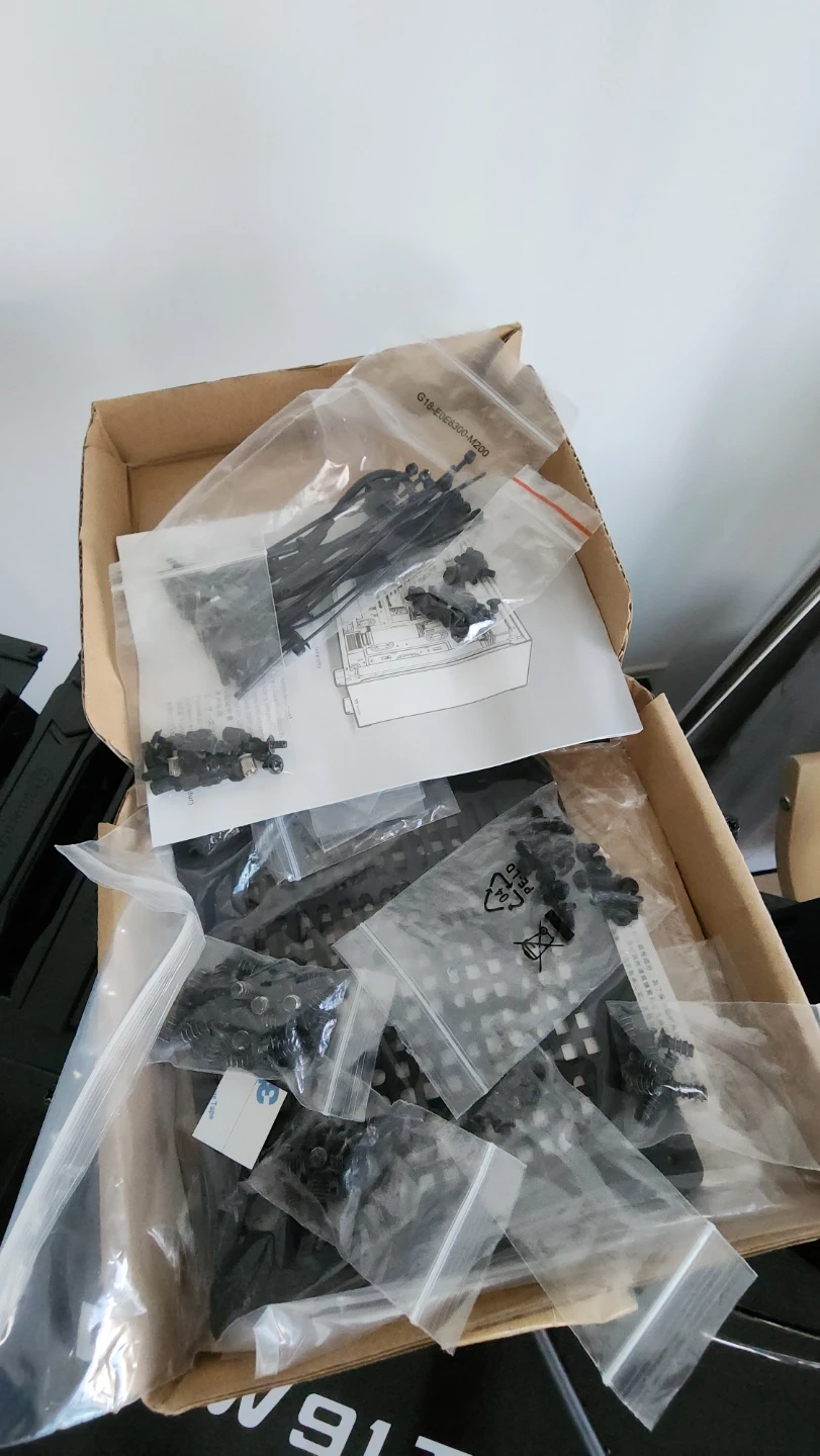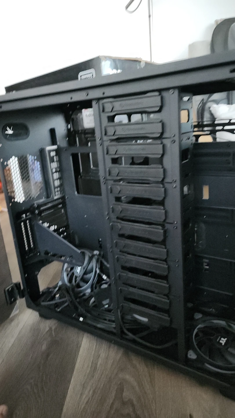 Comes with 4 x thermaltake 140mm RGB fans, massive harddrive cage and vertical gpu mount that's removable, front header cables and all the screws and accessories along with original packaging and padding