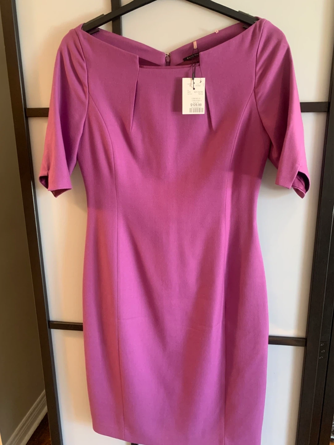 A chic pink sheath dress from Elie Tahari. It features a flattering square neckline and 3/4 sleeves. Fully lined with a back zipper closure.