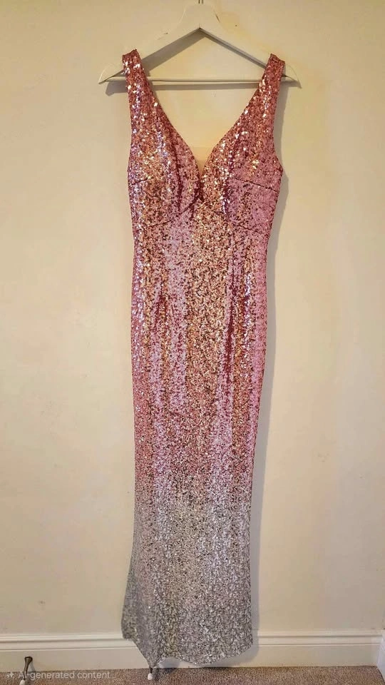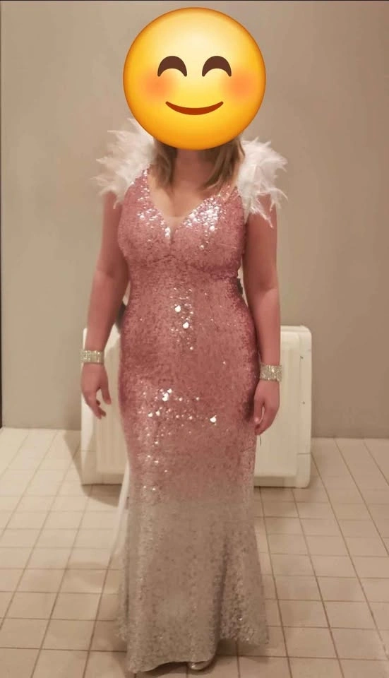 Prom is coming! This size 12 gorgeous pink silver gradient sequined gown is perfect to hug you in all the right places. It stretches and moves with you. Its floor-length with a slightly tapered waist and flared bottom. There is a skin tone sheer insert at the deepest v, to help the straps stay up. The dress is lined with a very soft pink stretch material, so you are wrapped in comfort. It zips up at the back and has special sewing to help your rear look amazing! Size 12, it was bought in Amsterdam. Pick-up is at Elgin Mills and Leslie.