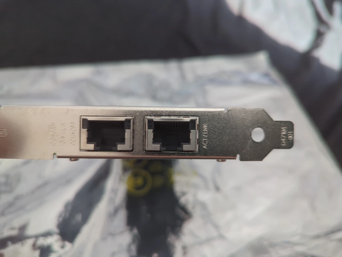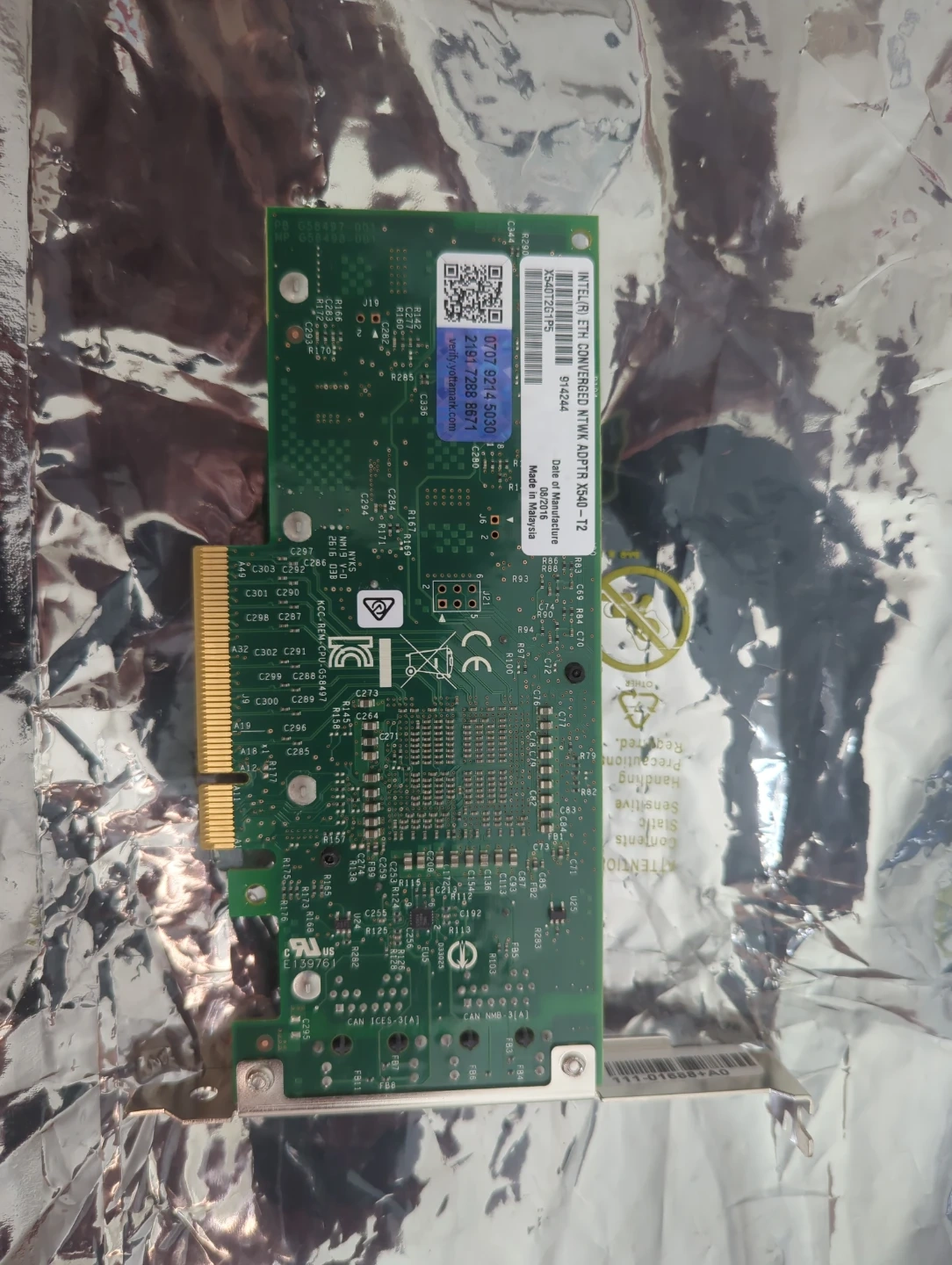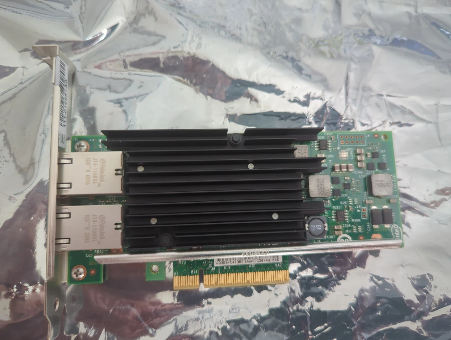 This is an Intel network adapter. It's an X540-T2 model. It has two RJ45 Ethernet ports.