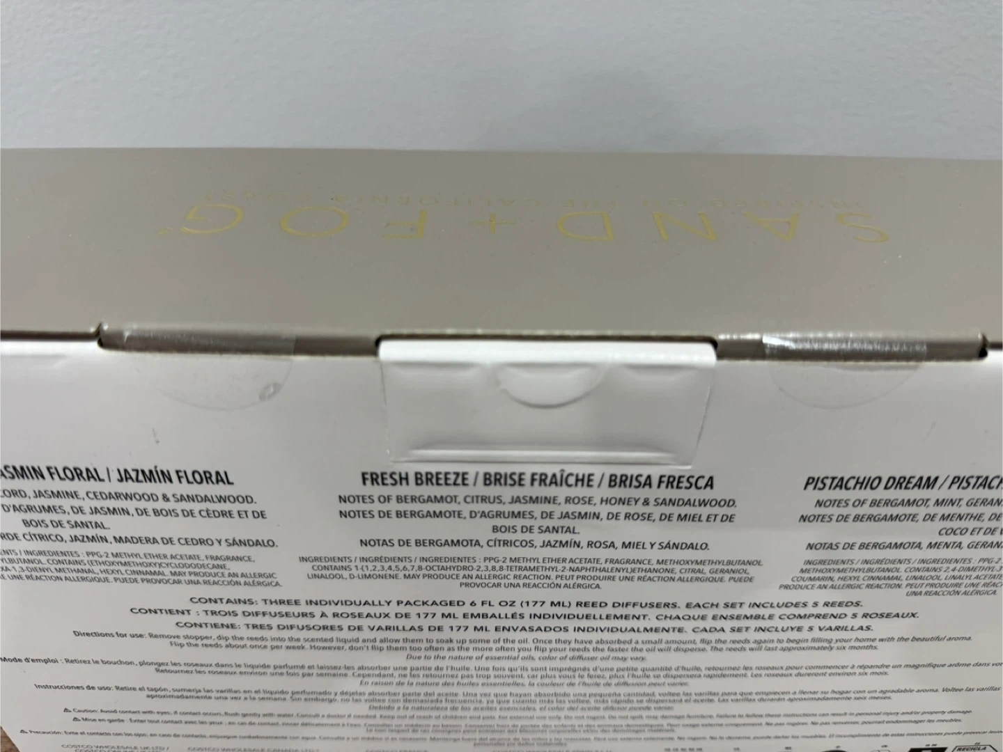 This Sand + Fog reed diffuser set includes three individual 6 fl oz (177 ml) diffusers. The scents are Floral Jasmine, Fresh Breeze, and Pistachio Dream. Each set contains three reeds.