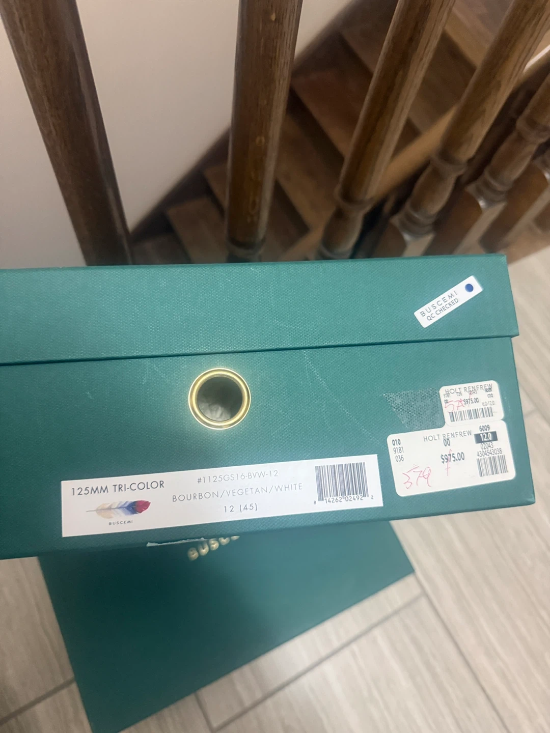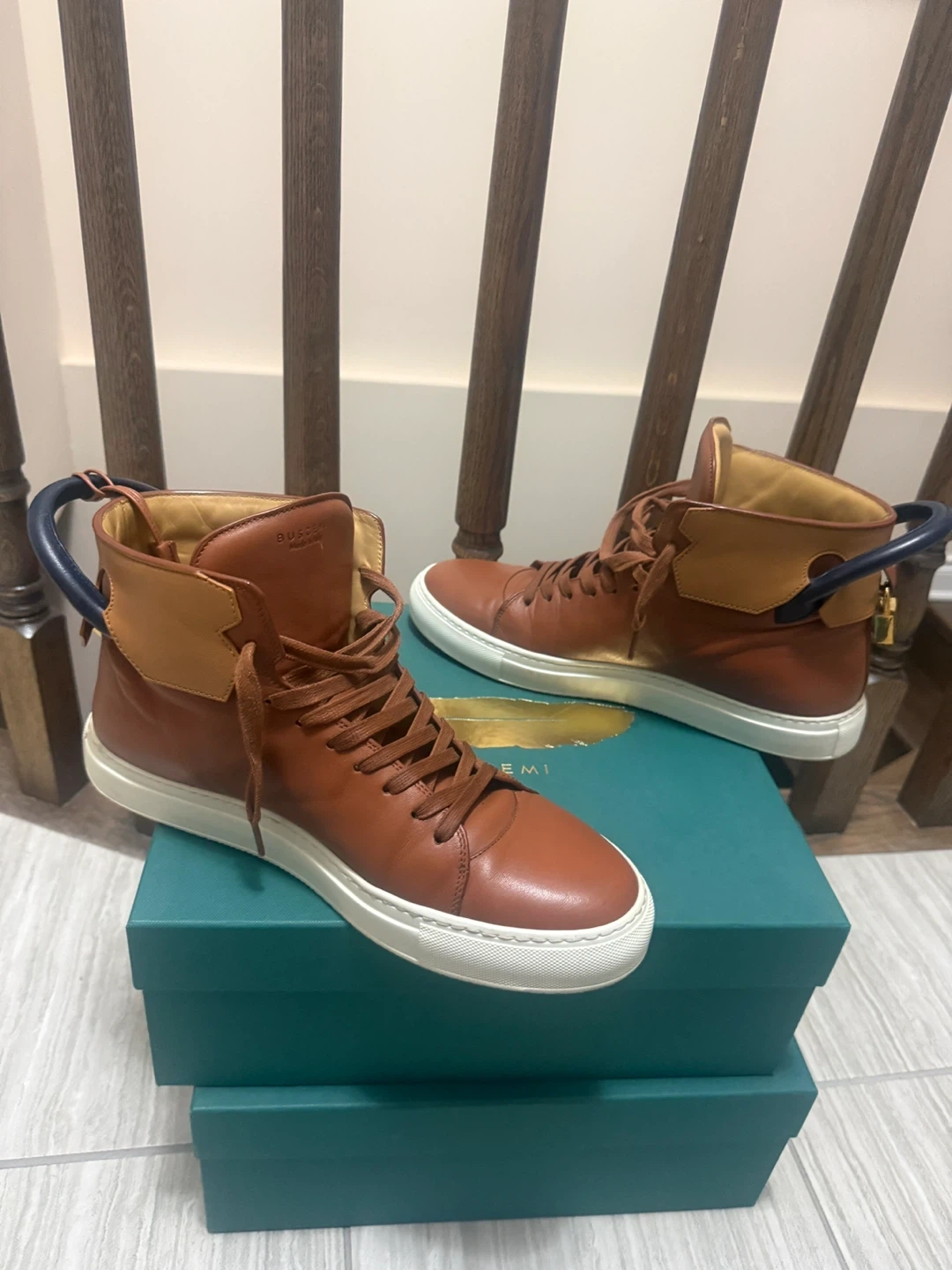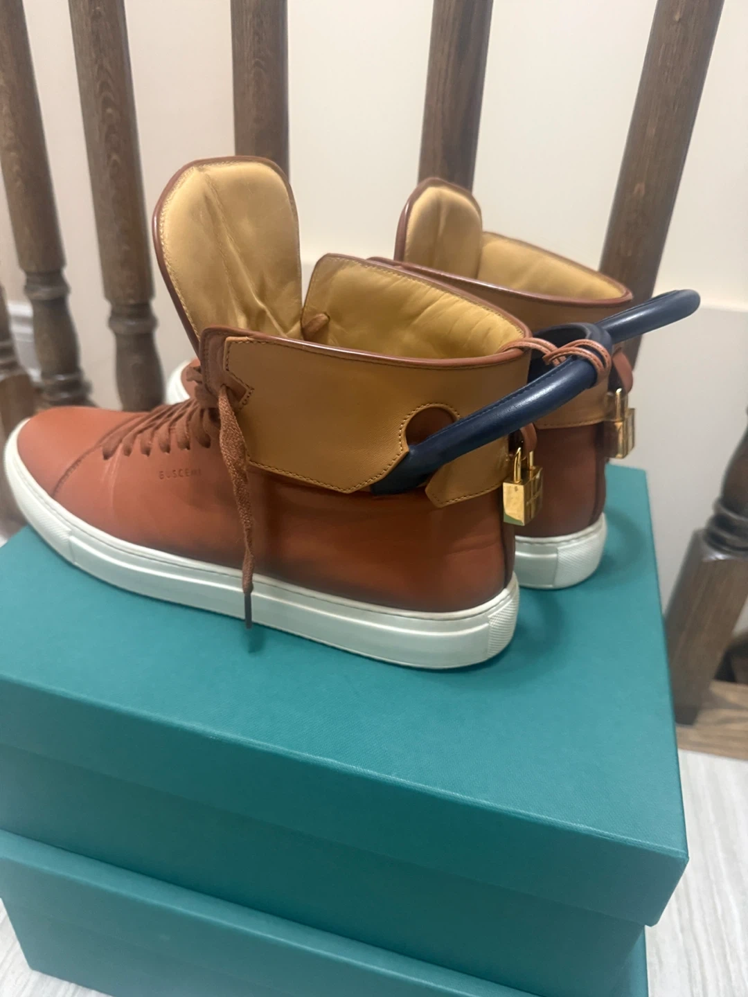 Buscemi high top sneakers in a tri-color design. Features a Bourbon/Vegetan/White colourway and a size 12 (45) fit. Made in Italy. Includes original box and iconic padlock detail.