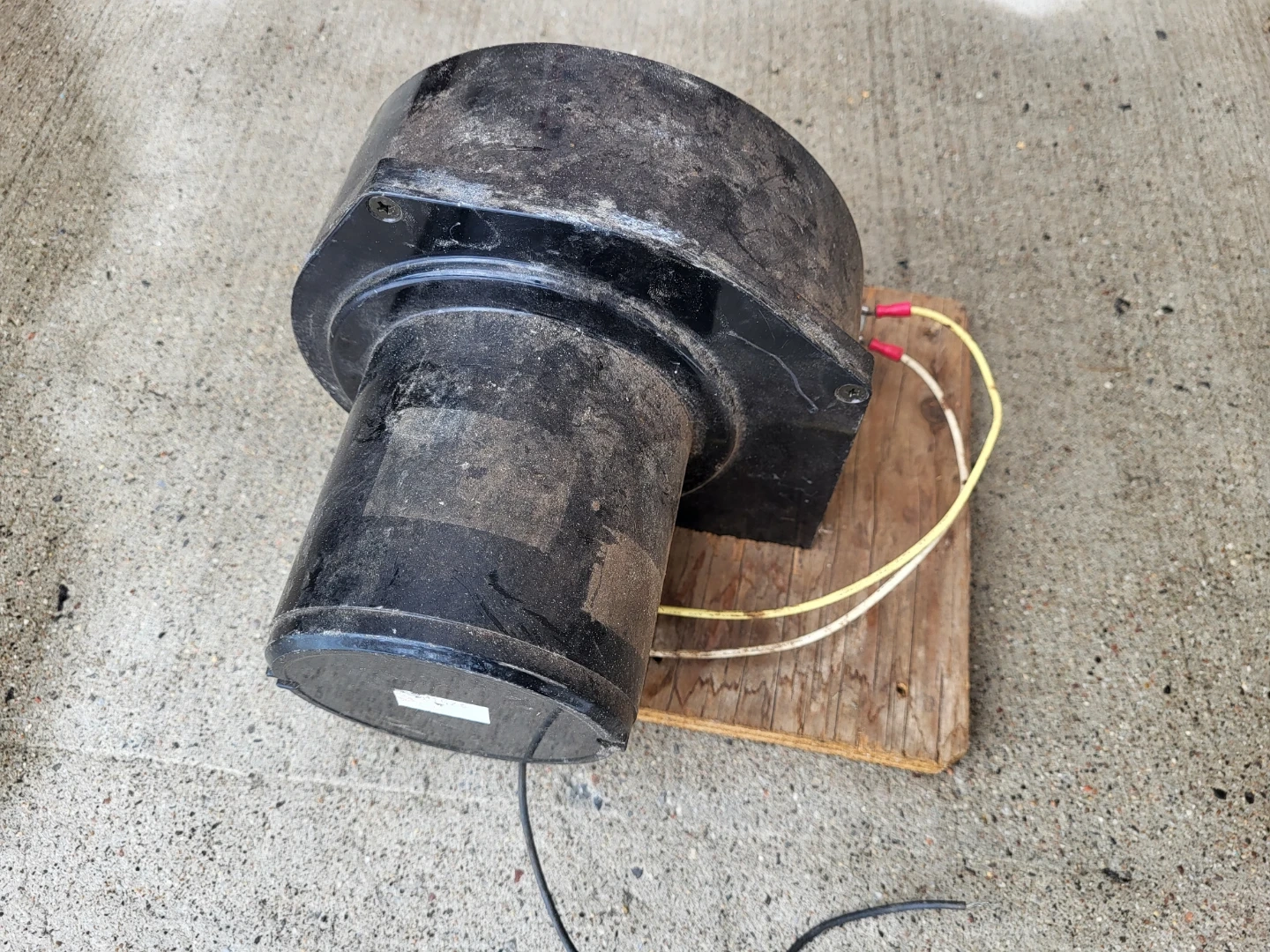 This is a used black blower fan motor assembly. It's mounted on a wooden base for stability. Comes with a capacitor attached to the motor housing. This unit appears to be in working condition.