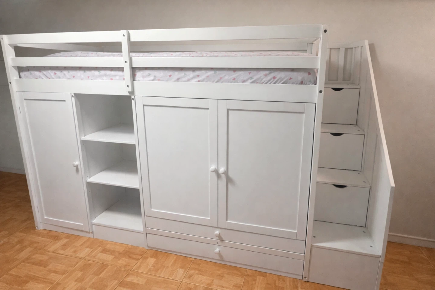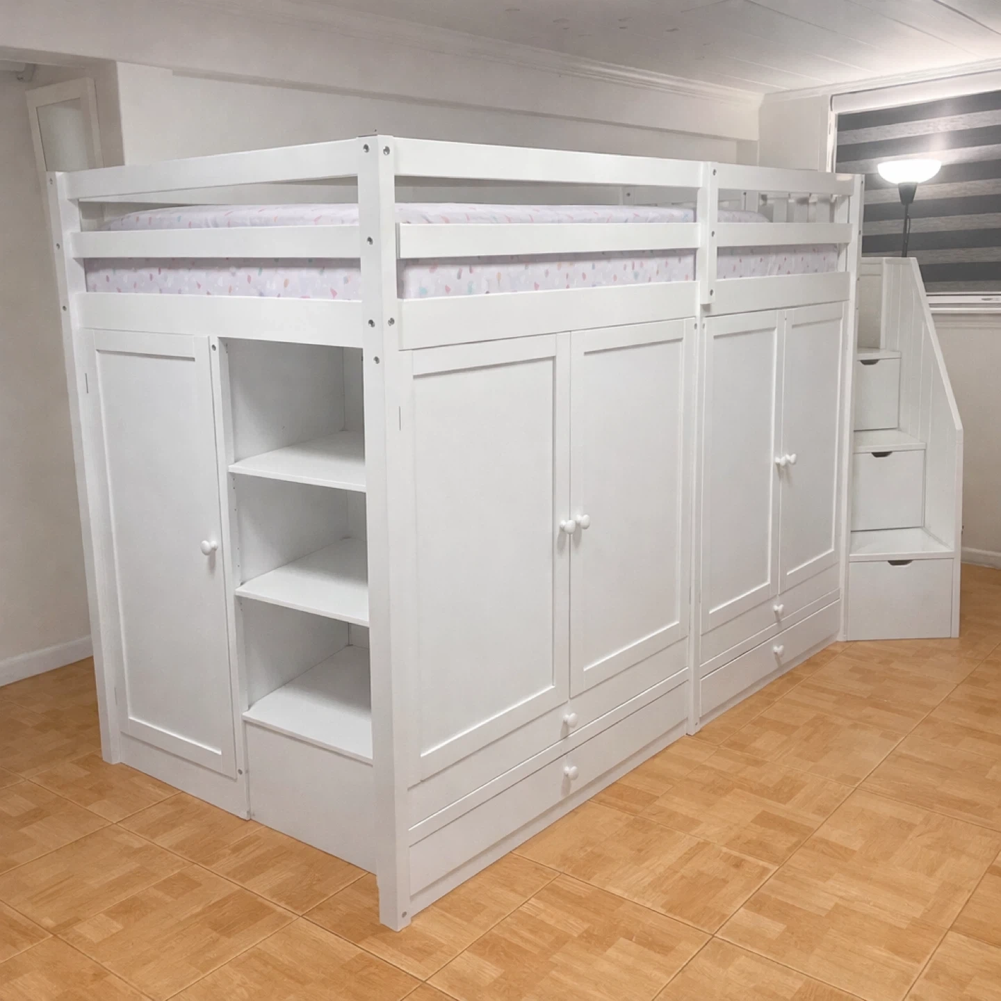 Beautiful SOFTSEA twin loft bed in white, perfect for kids or teens.