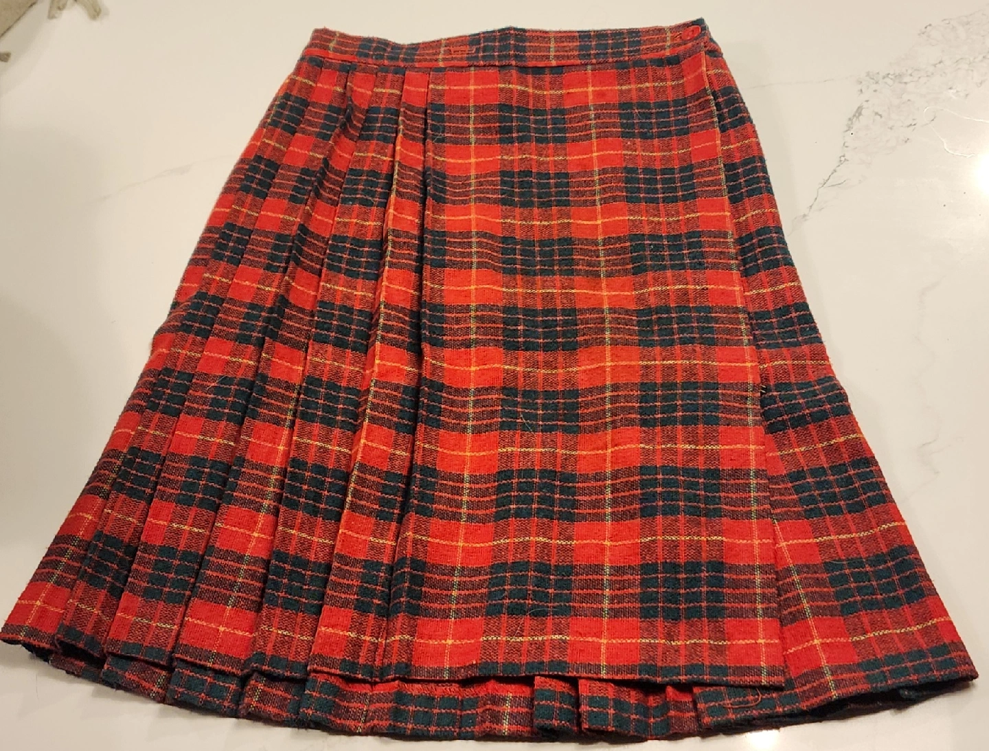 Childrens kilt from 1980s. It features a red plaid pattern with pleated detailing.