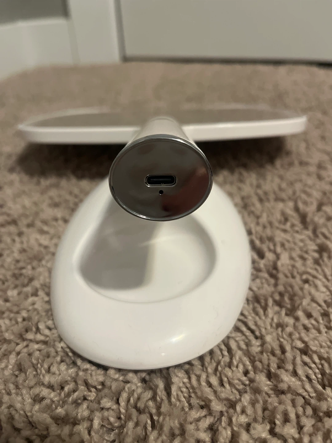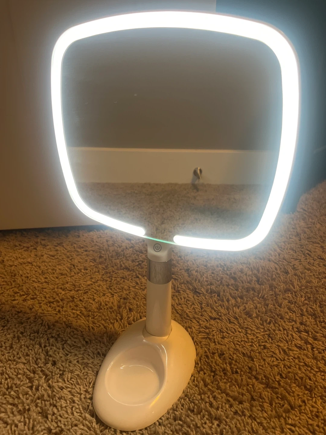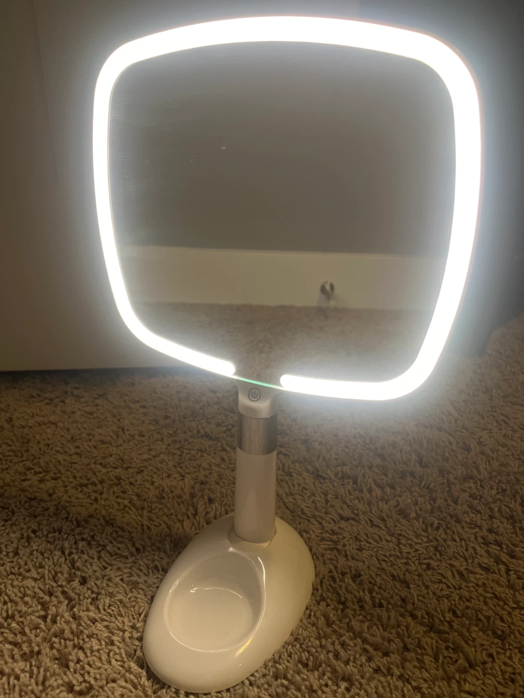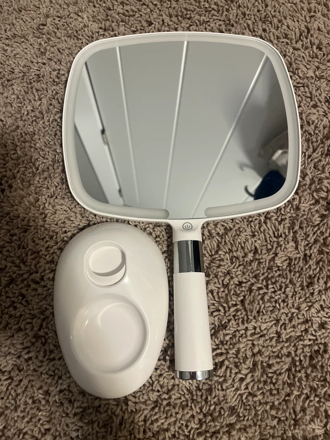 Portable light mirror with three different light options. Comes with a stand that adjusts and has a small dish to store accessories like hair ties. Charges with USB-C cable.