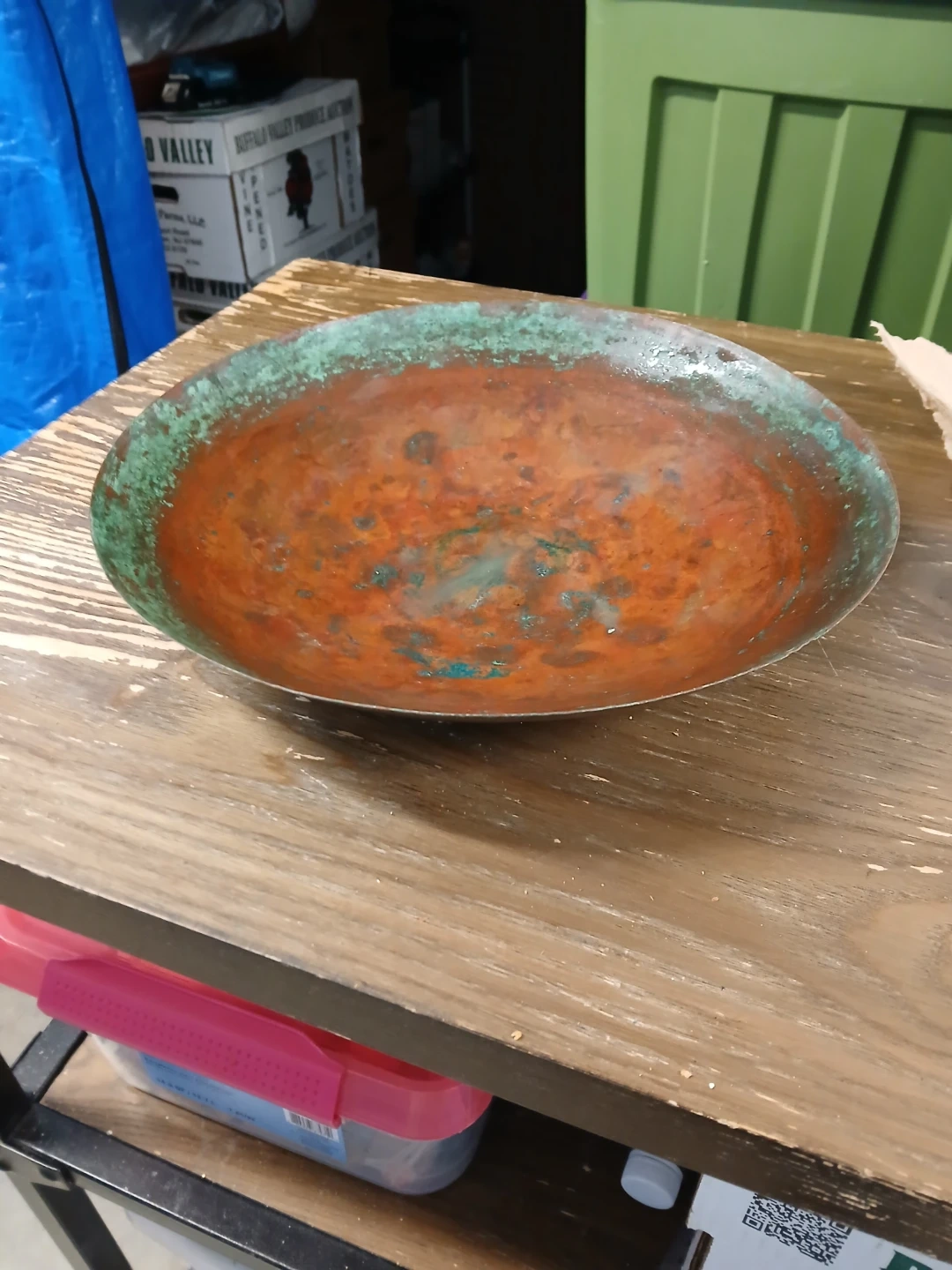 This is a vintage copper bowl with a distinct green patina on the rim and interior. The underside is smooth and shows a warm metallic sheen. It's a decorative piece with a classic shape. Its size makes it suitable for holding small items.