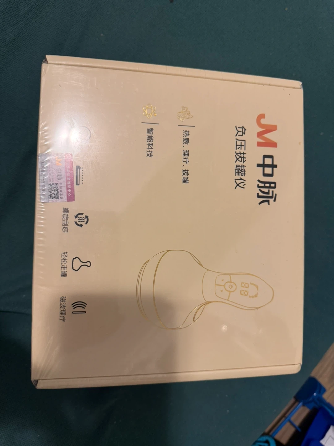 This is a JM Zhongao electric cupping device for heat therapy and massage. It features smart technology and magnetic therapy. The device has a charging input of 5V and a battery capacity of 1200mAh.