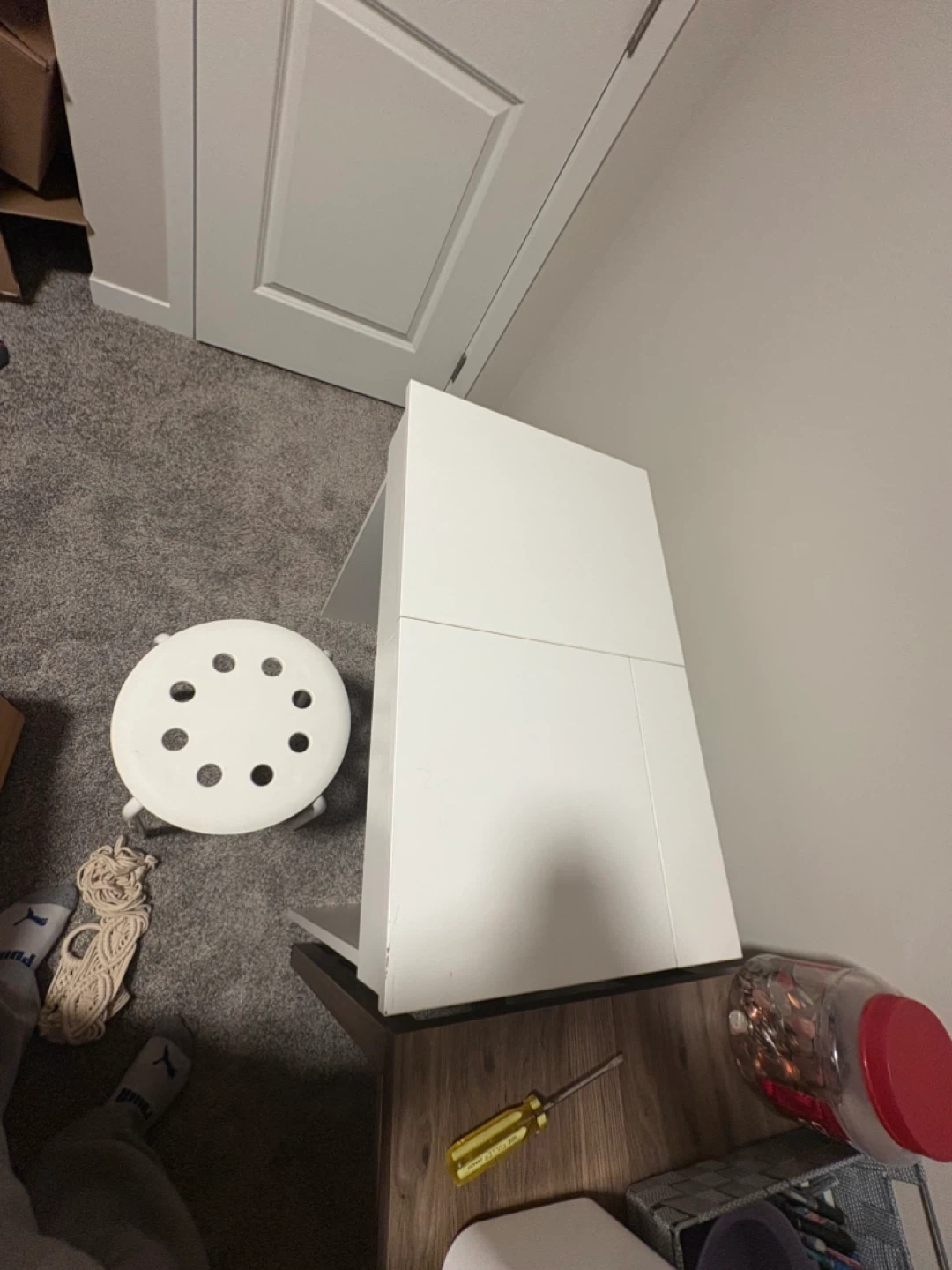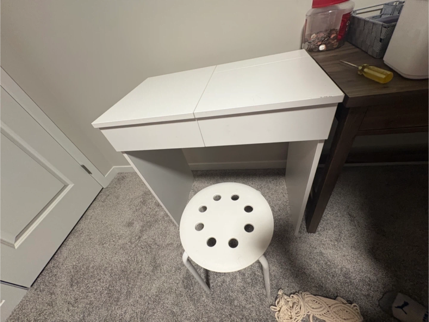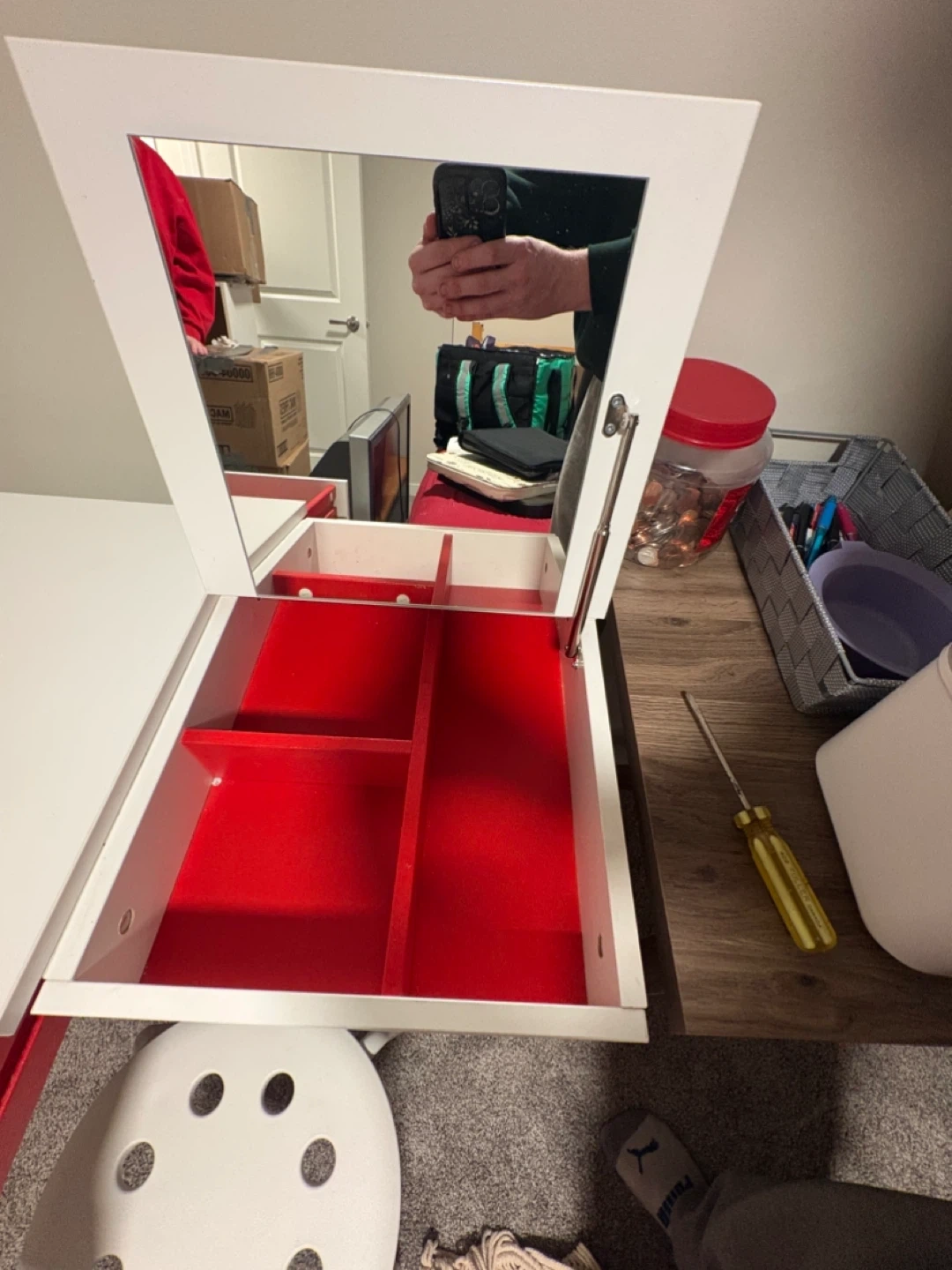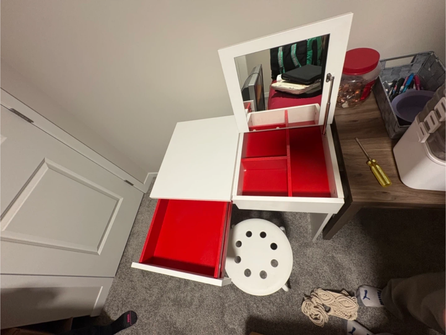 Compact white vanity desk featuring a mirrored lid and bright red lined compartments for organization. It includes one deep drawer and a smaller top drawer, perfect for makeup or accessories. This desk would be great for a bedroom or dressing area!