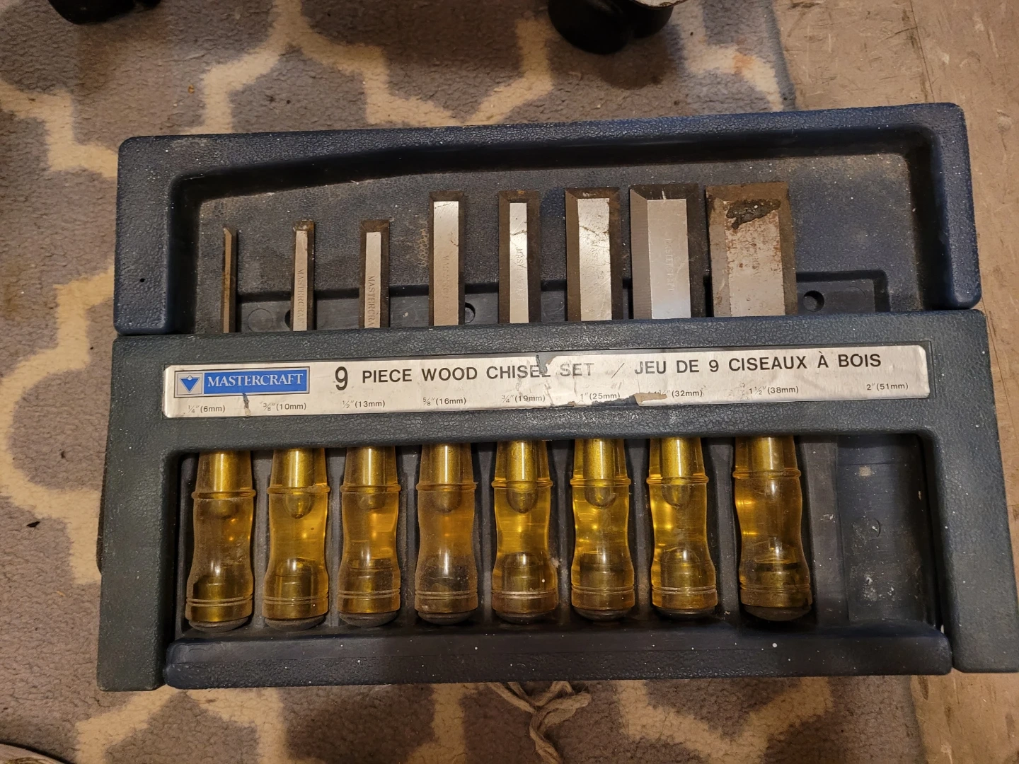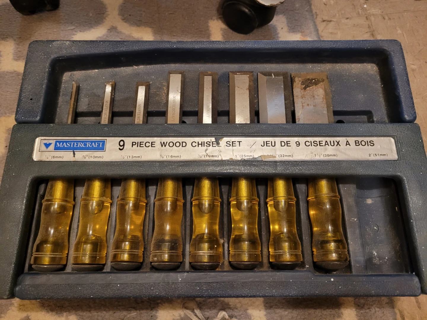 This is a Mastercraft 9-piece wood chisel set. It includes various sizes ranging from 1/4" (6mm) to 2" (51mm). The set comes in a durable carrying case.