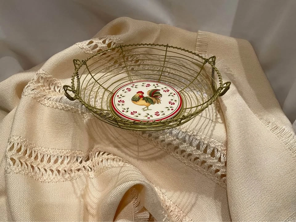 Beautiful Metal Rooster Basket. Ceramic Rooster Plate. Royal Doulton Chanticlair Basket. Width 11”. #202/350. Cash Only - Richmond Hill / Bathurst & King Rd.