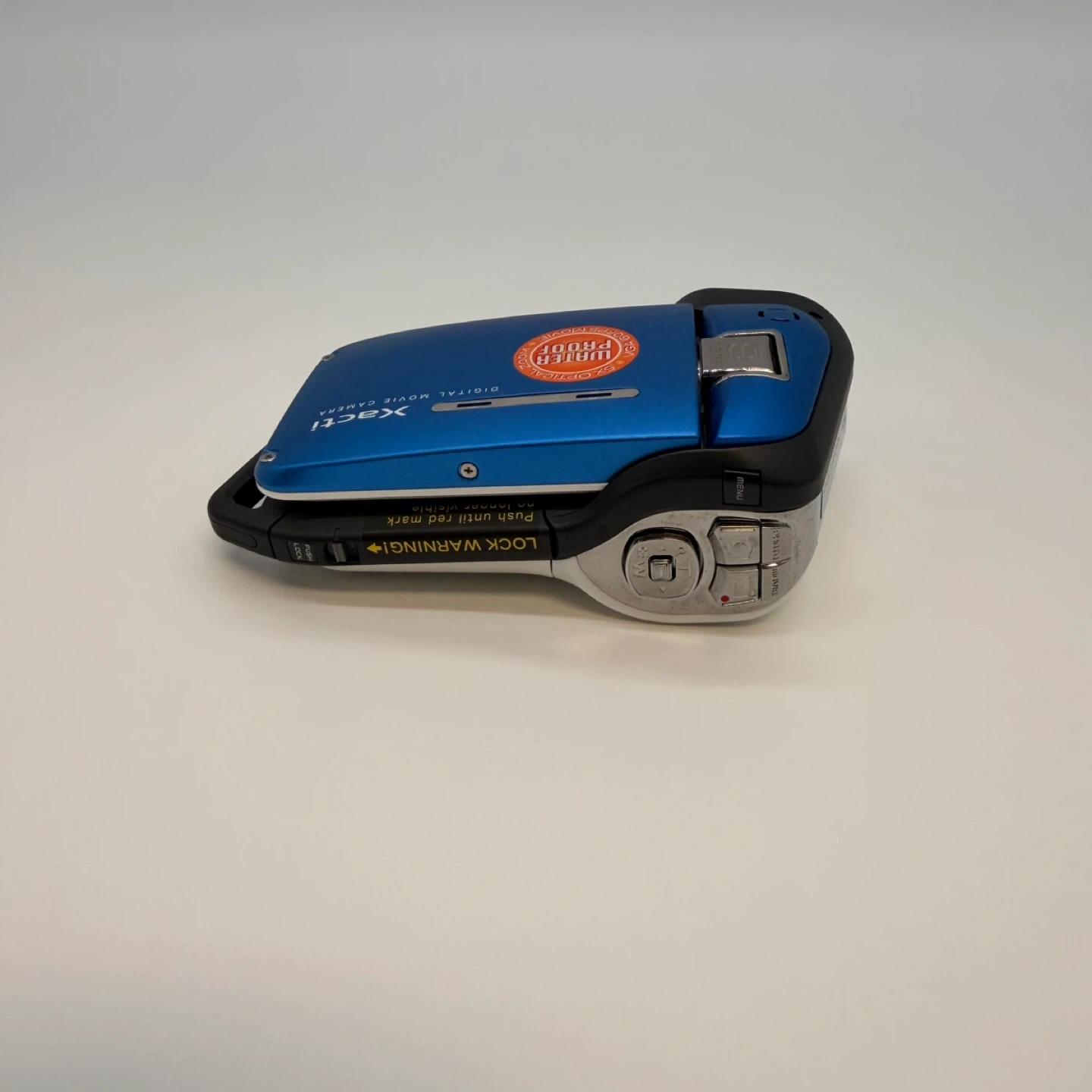 This is a blue Sanyo Xacti E2 waterproof digital movie camera. It's designed to record video and capture photos. The camera is waterproof and comes with its original box and accessories.