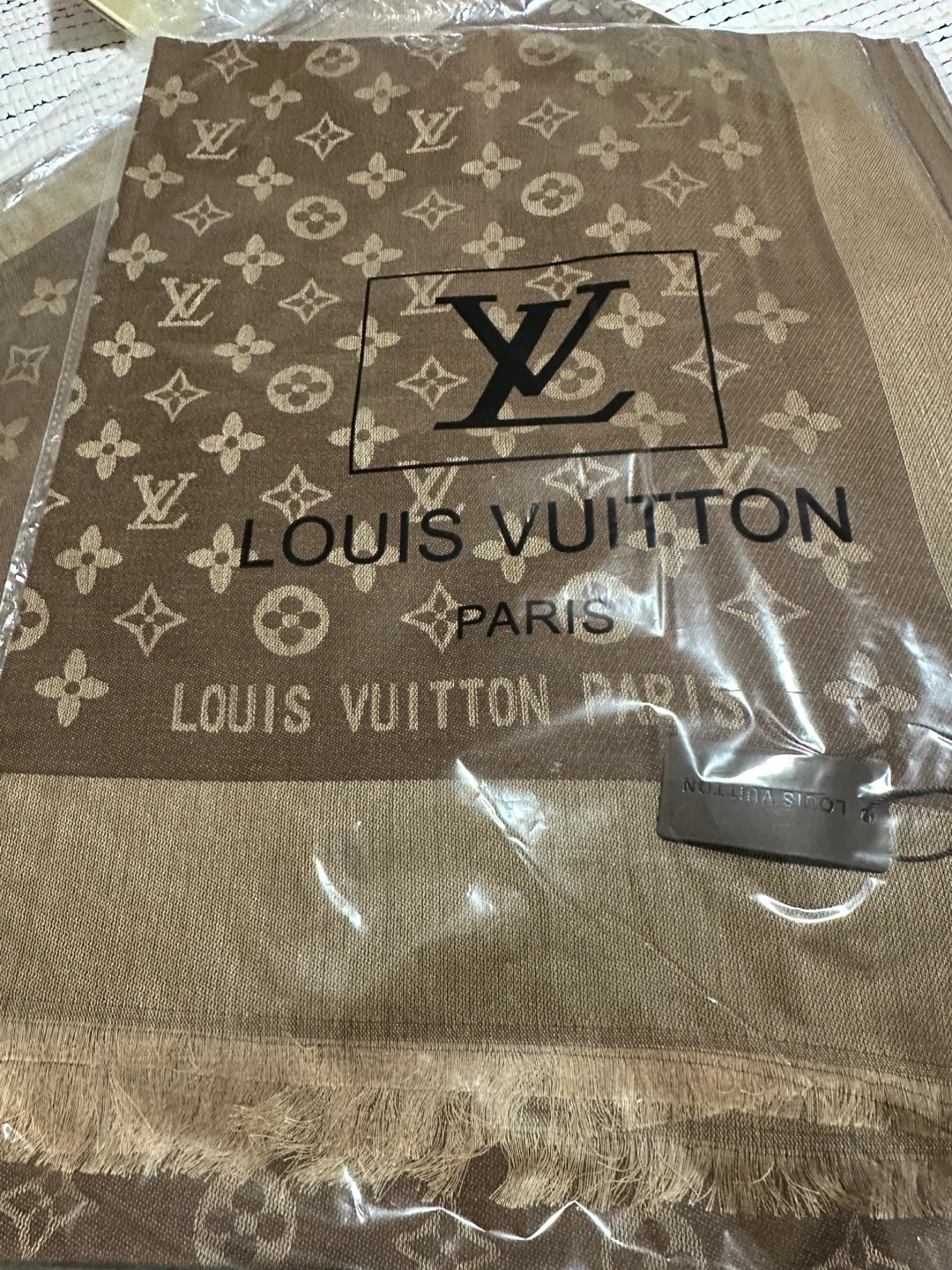 Louis Vuitton scarf featuring the iconic monogram pattern. It has a fringed hem and is made of a wool or silk blend. Perfect for adding a touch of luxury to any outfit!
