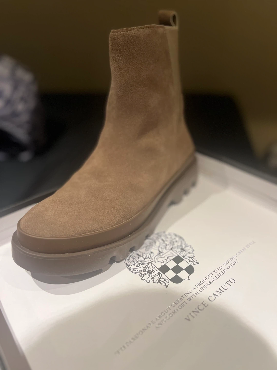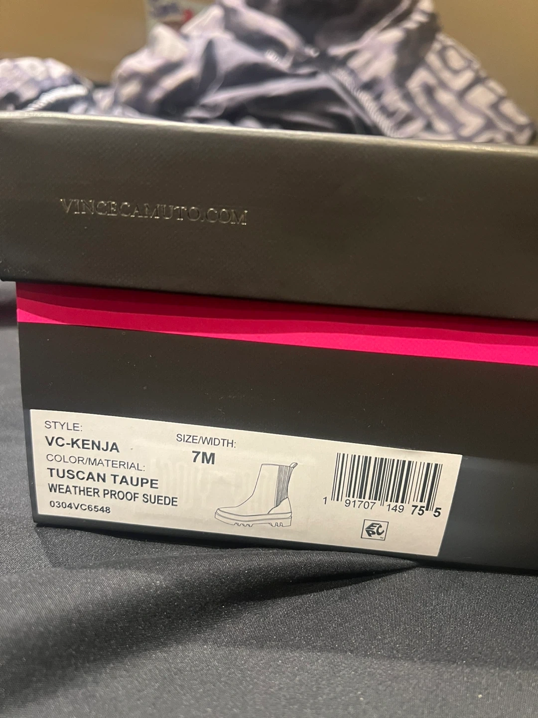 These Vince Camuto VC-KENJA boots are made with weather-proof suede in a Tuscan Taupe colour. They are size 6M and 7M and feature a side zipper. They're a stylish choice for wet weather!
