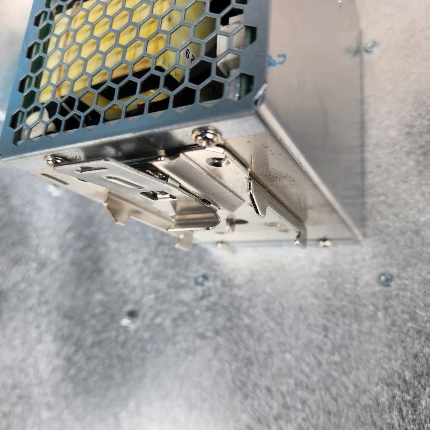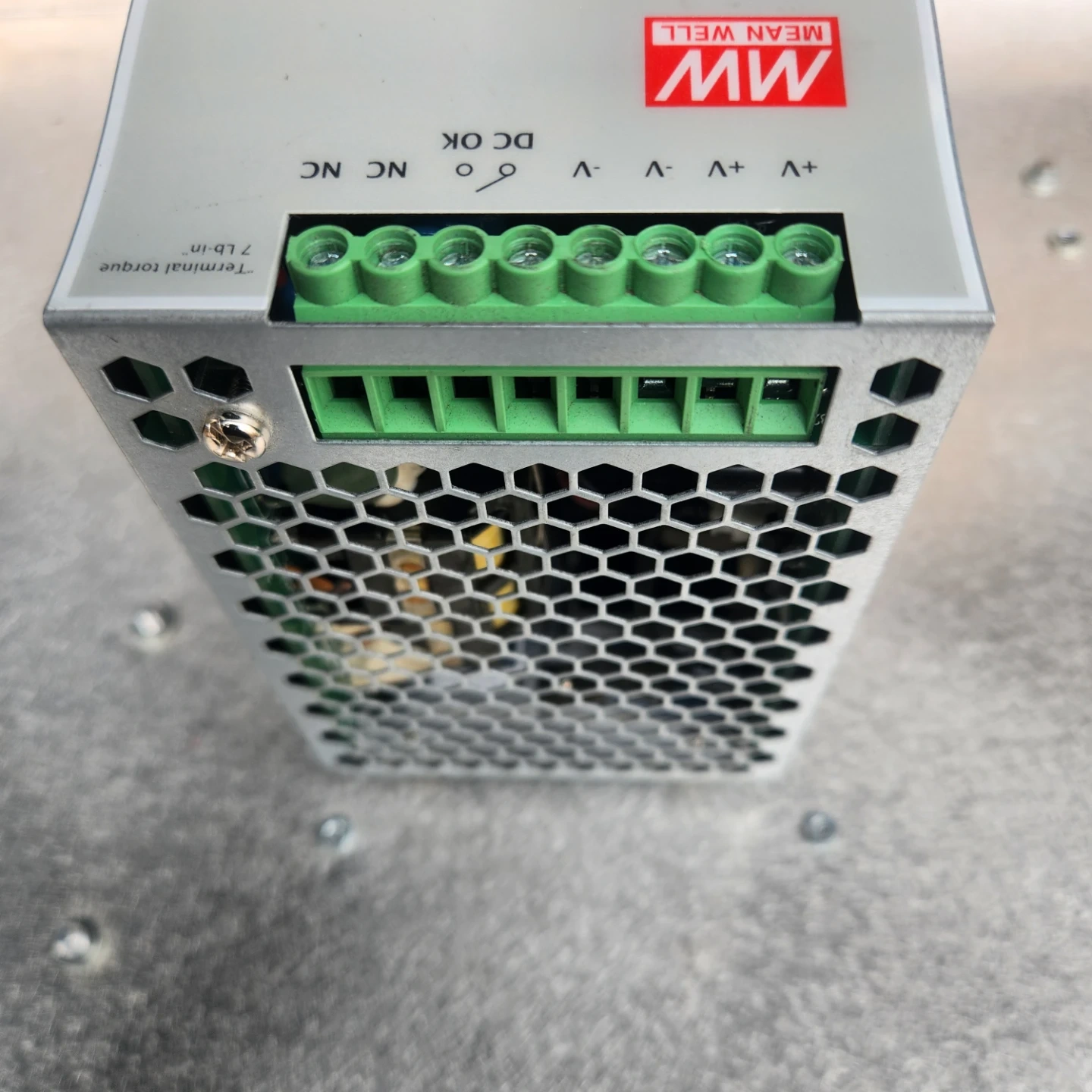 This is a Mean Well SDR-480-24 power supply. Input is 100-240VAC 5.0A and output is 24V 20A. Maximum surrounding air temperature is 60°C. Made in Taiwan.
