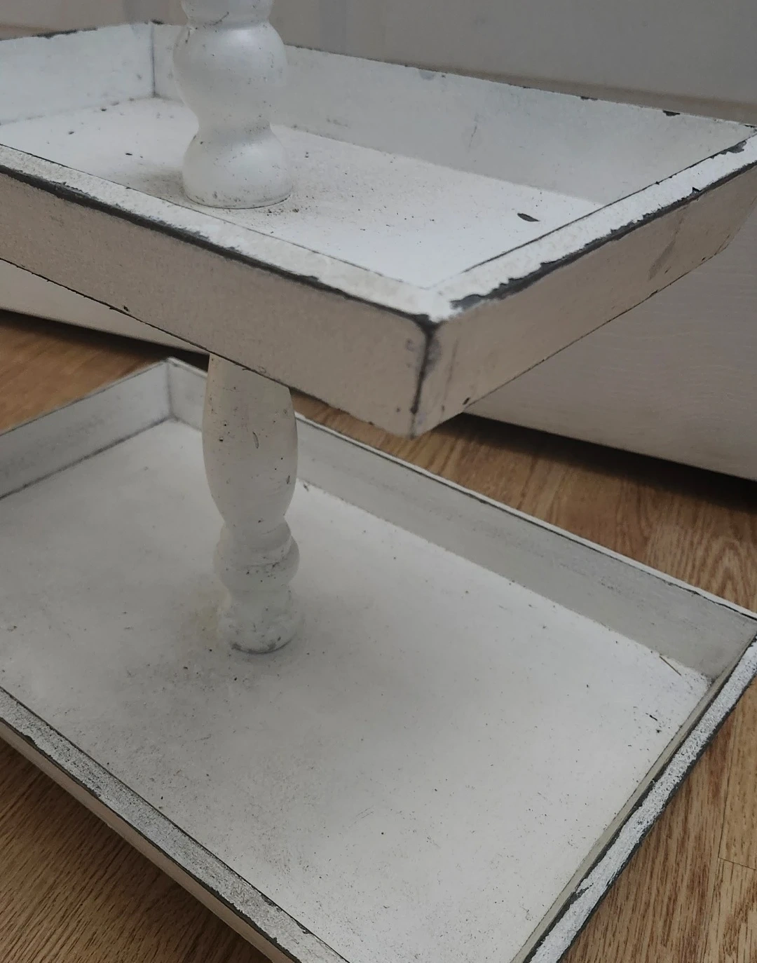 White two-tiered tray made of wood and features a distressed finish. Great for displaying treats or small decor items!