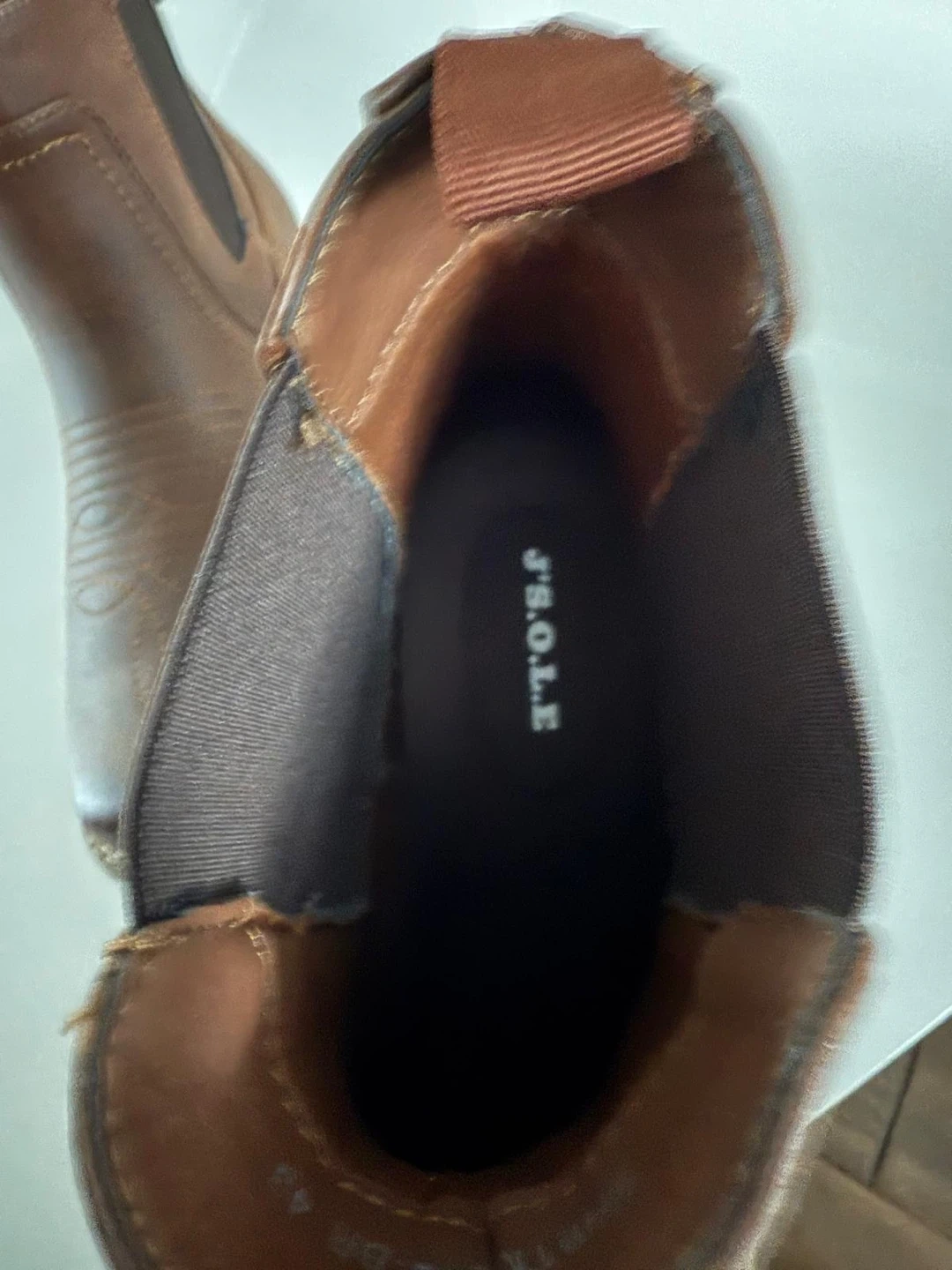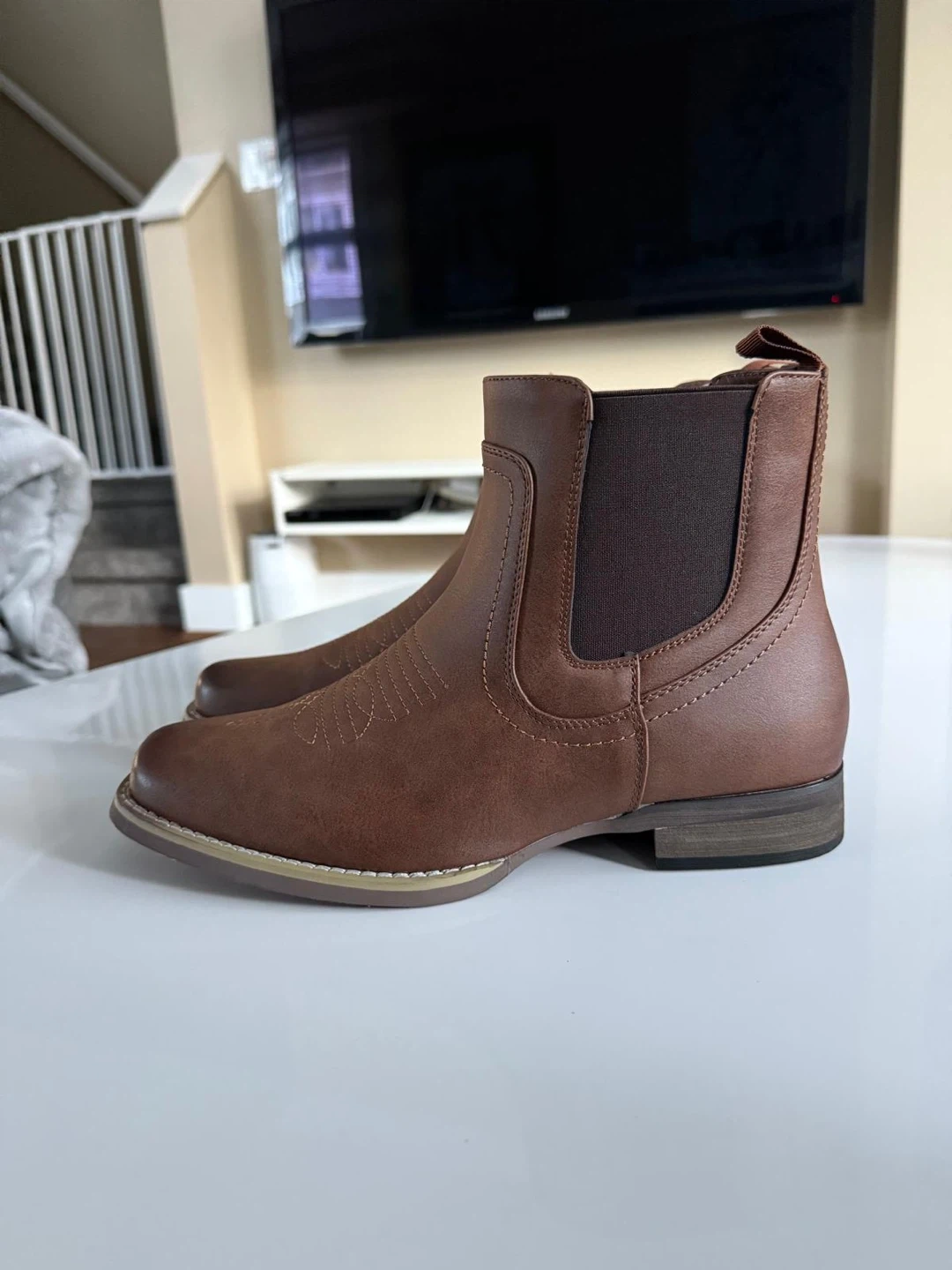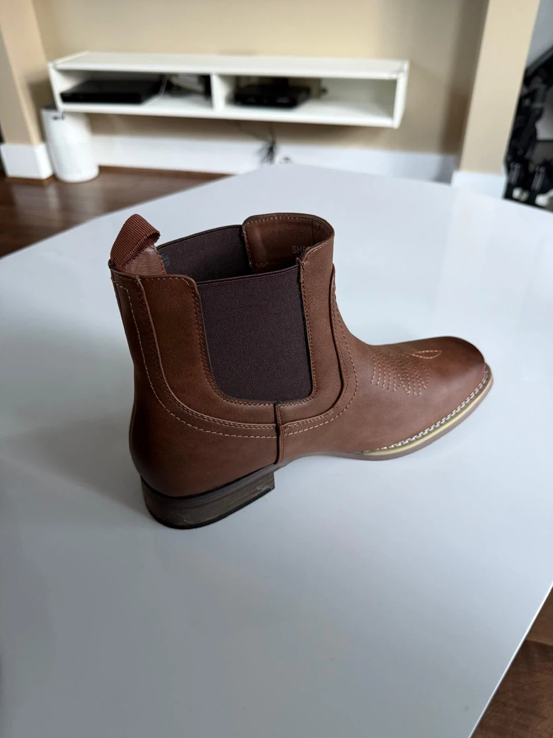 Stylish brown Chelsea boots with elastic side panels. These boots feature a pull tab at the back for easy on and off. Brown faux leather material.