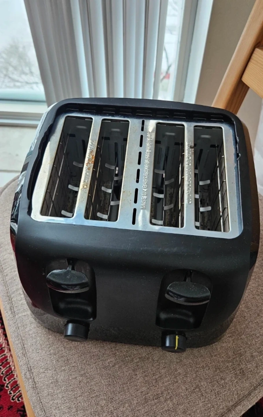 Selling a black 4-slice toaster! It has some visible wear and tear on the side, but it's still fully functional and ready to make some toast. Perfect for a family or anyone who loves a good breakfast