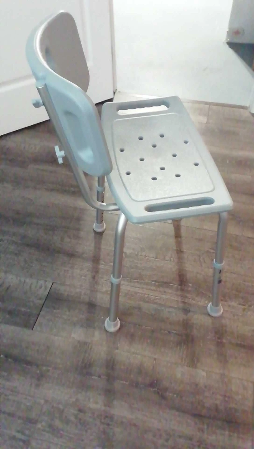 Adjustable height shower chair with backrest and armrests. It's made of durable plastic and aluminum. This chair offers stability and support in the bath or shower.Dad is in a retirement center no need for it