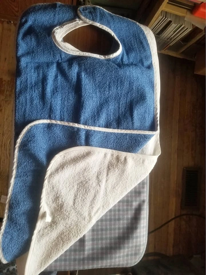 Selling a bundle of 3 adult bibs and a hospital gown, great for caregivers providing home care