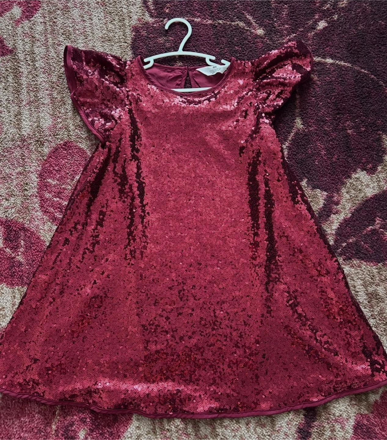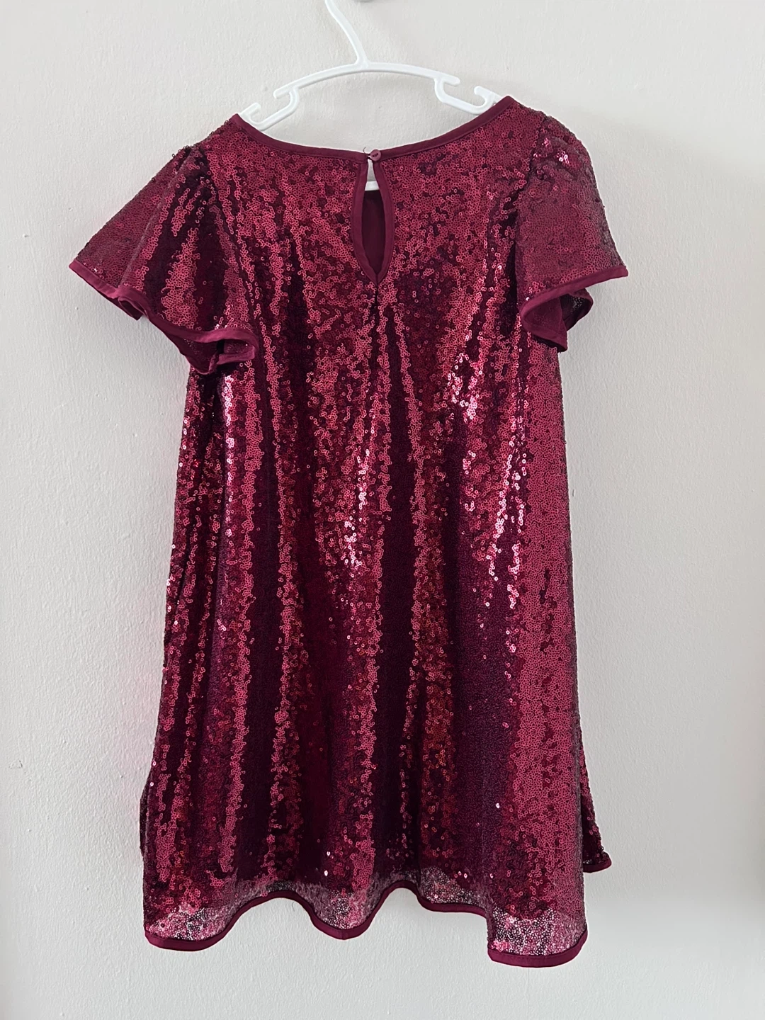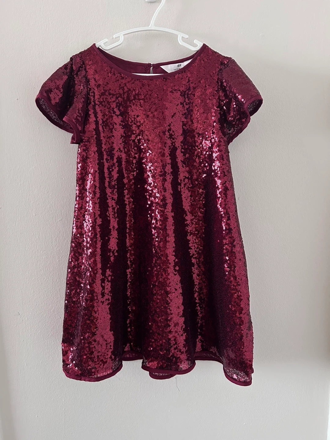 Sparkly burgundy sequin dress from H&M. It's a size 7-8 years, perfect for parties or special occasions! The dress has short flutter sleeves and a pull-on style with a back keyhole closure.