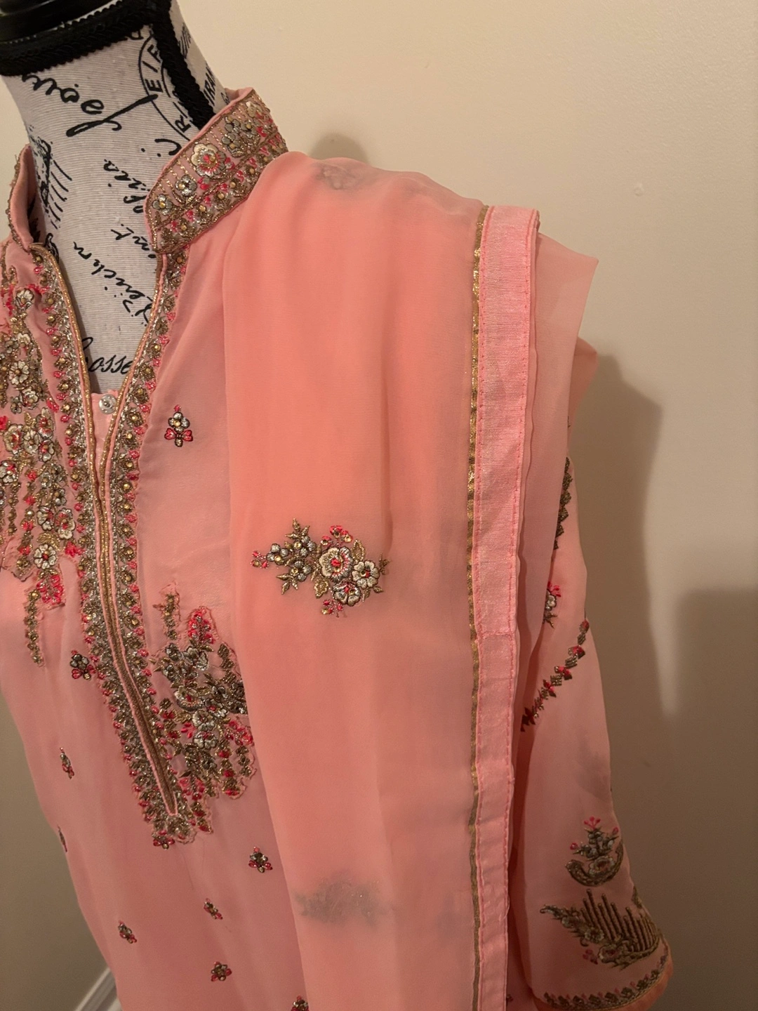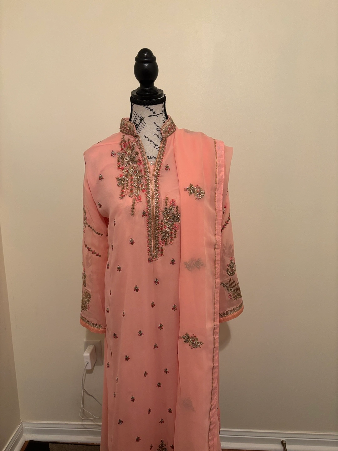 Beautiful peach coloured salwar kameez. Intricate embroidery. Long sleeves. Comes with matching dupatta. Gorgeous outfit for any special occasion.