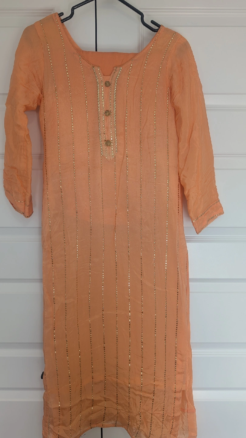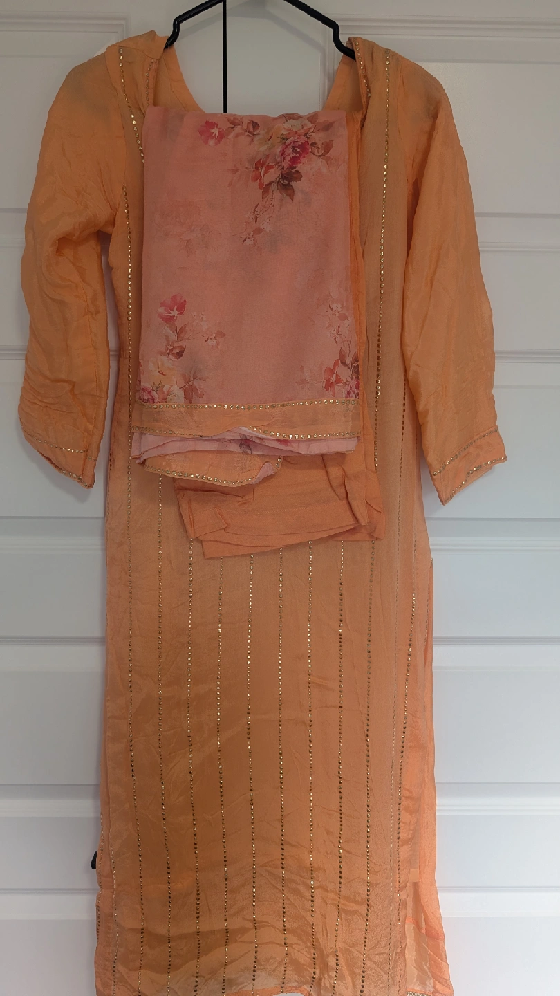 10Selling a beautiful peach-coloured salwar kameez suit. It's in great condition and includes the kameez, salwar, and dupatta. The fabric is lightweight and comfortable, perfect for warmer weather or special occasions! The suit features delicate gold detailing and printed dupatta.