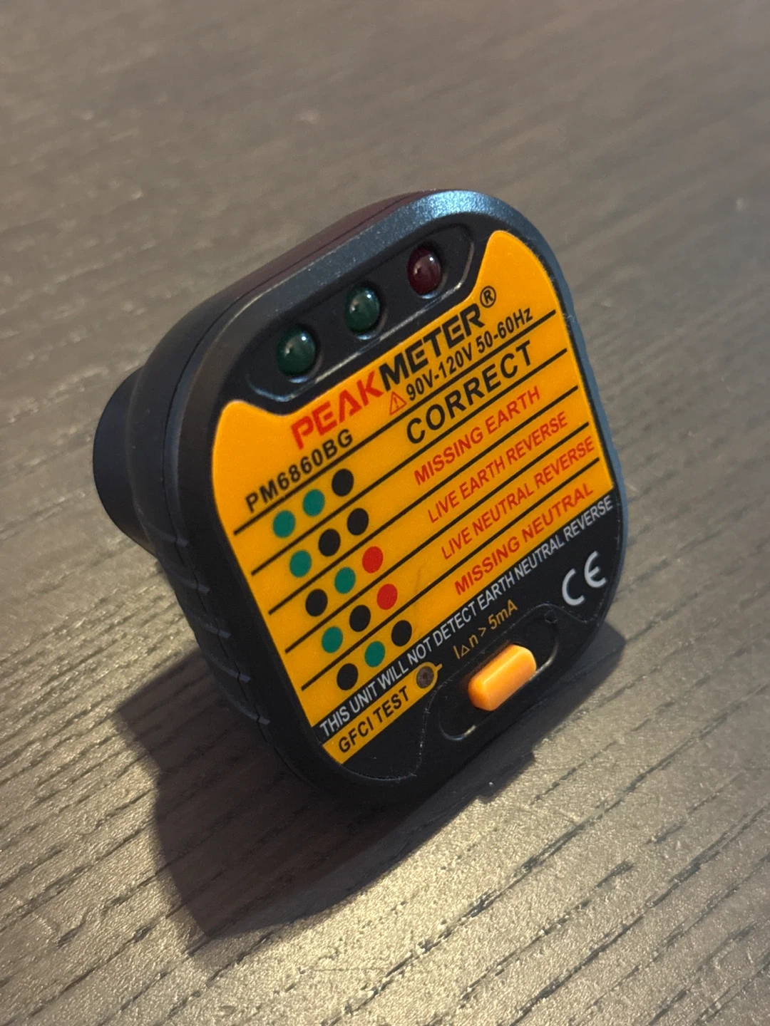92Selling a Peakmeter PM6860BG electrical tester. It's in great condition and ready to help you check your outlets. This unit tests for correct wiring, missing earth, live earth reverse, live neutral reverse, and missing neutral. It also has a GFCI test function. A handy tool to have around the house!
