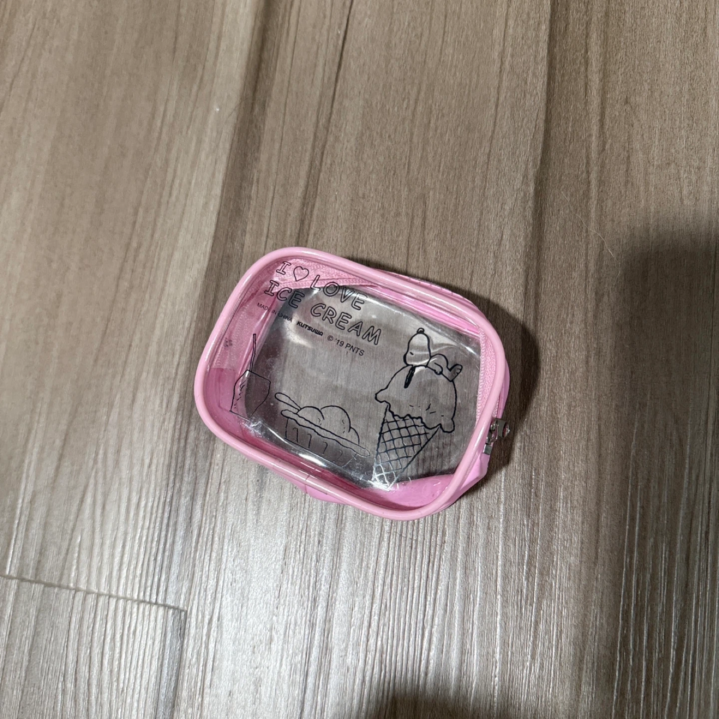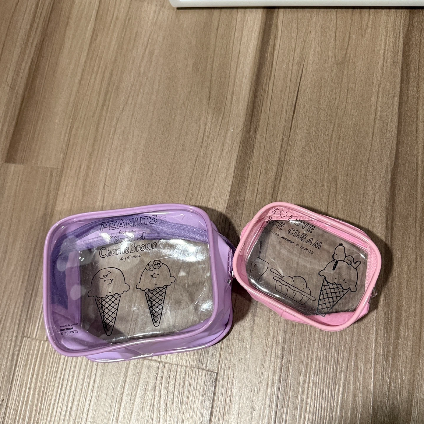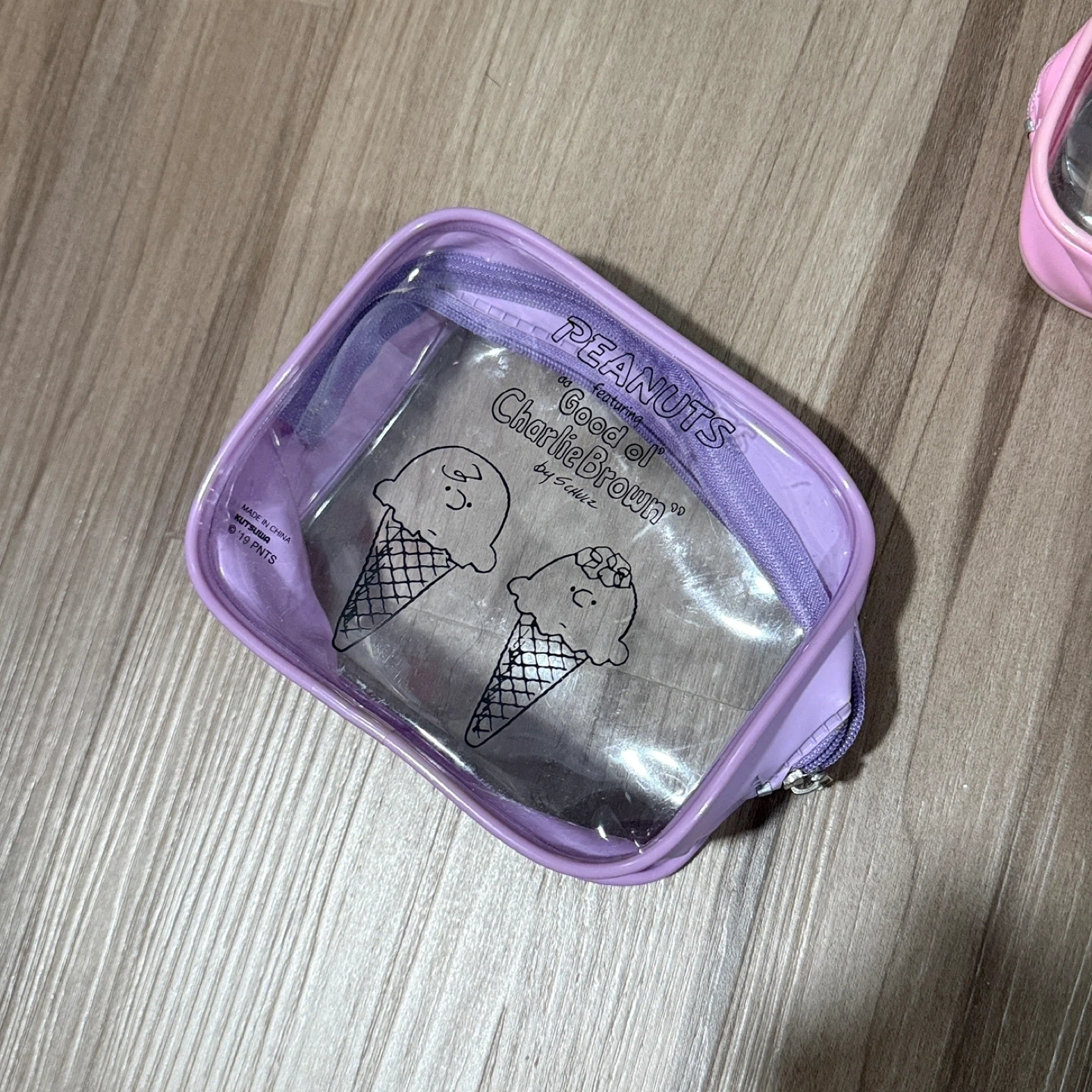 ✨Selling a set of two cute Peanuts cosmetic bags! One is lavender with a Charlie Brown ice cream design, and the other is pink with an 'I Love Ice Cream' Snoopy design.
