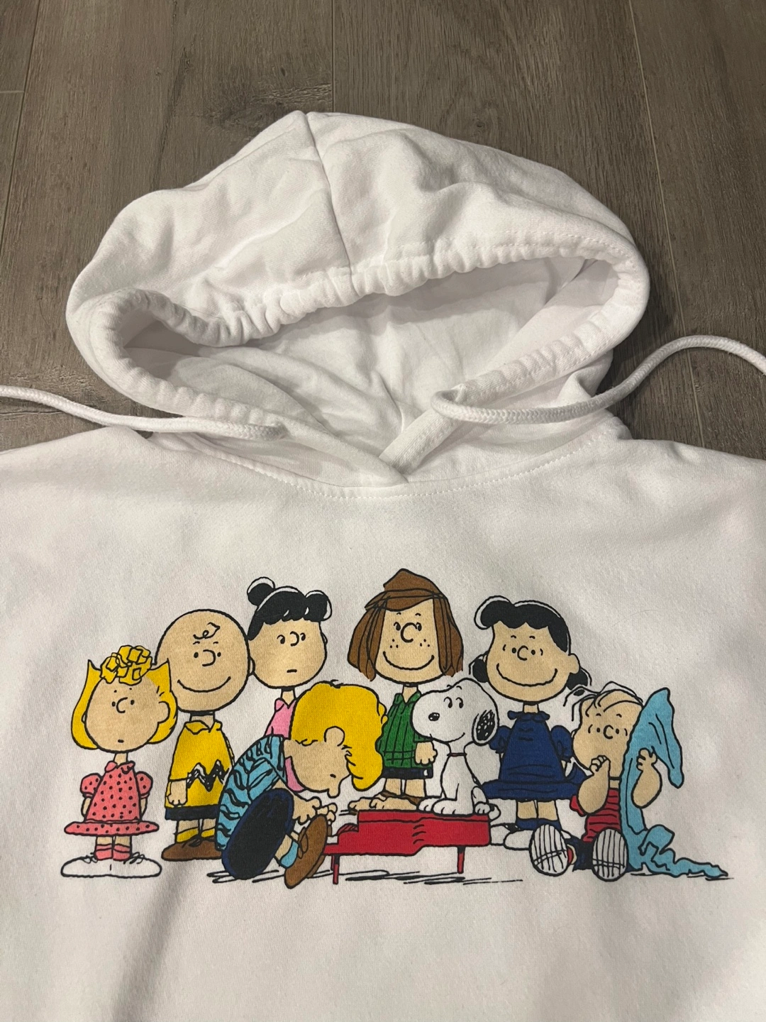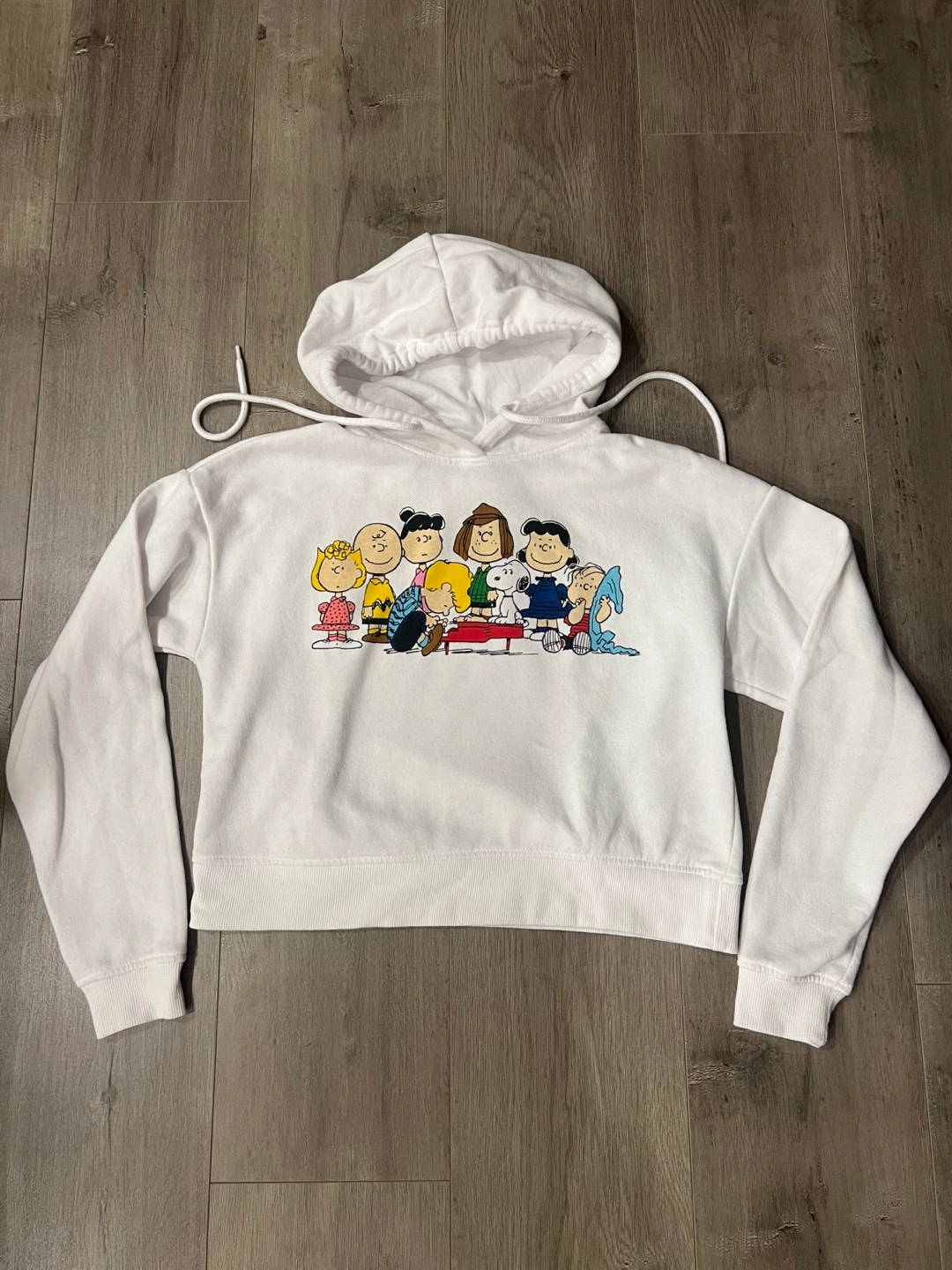 170White cropped hoodie featuring the Peanuts gang. Small size. Good condition. Soft material. Drawstring hood.