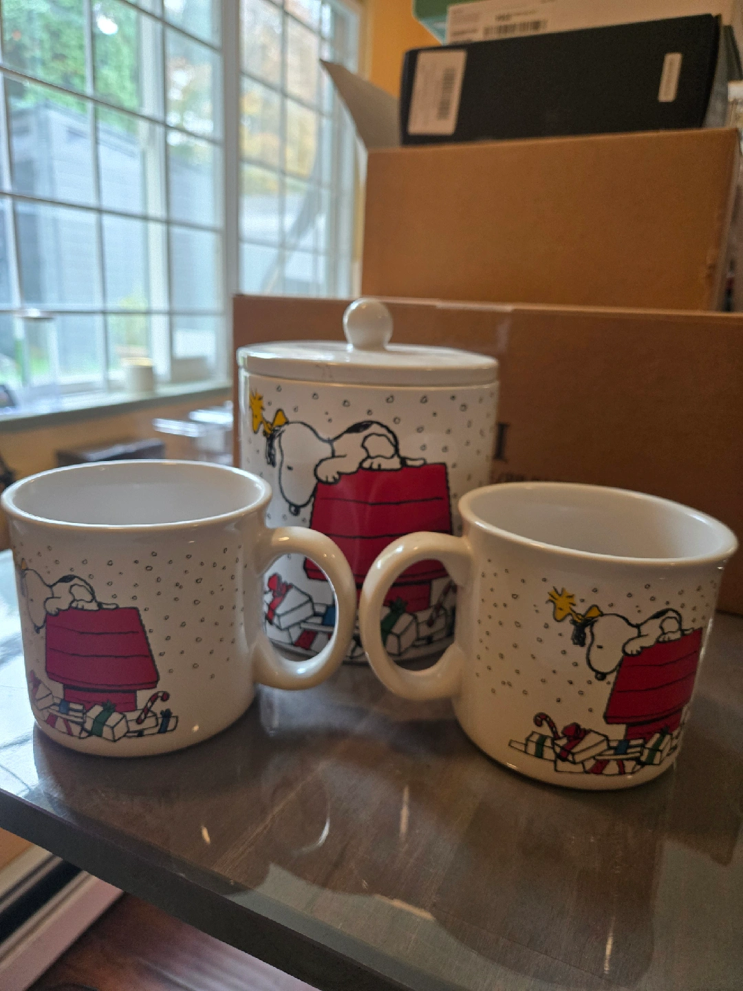 32Super cute Snoopy 2 mugs( big size) and jar set! Features Snoopy on his dog house surrounded by presents. Perfect for the holidays!