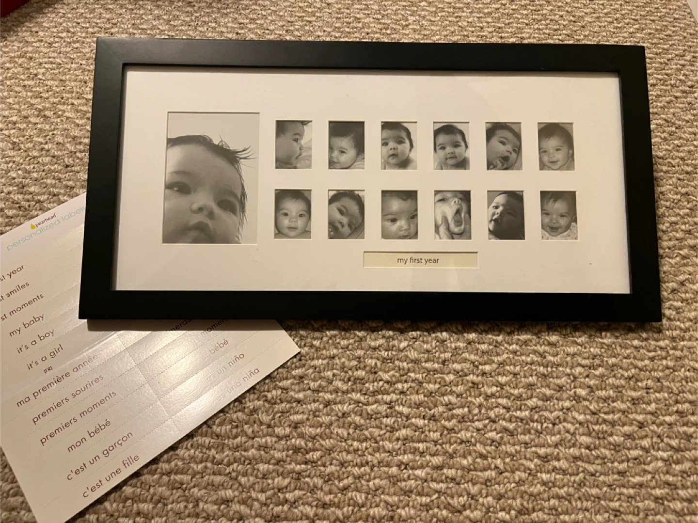 Pearhead 'My First Year' baby photo frame. Also comes with personalized labels in English, French, and Spanish.